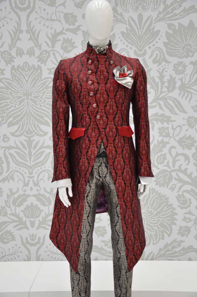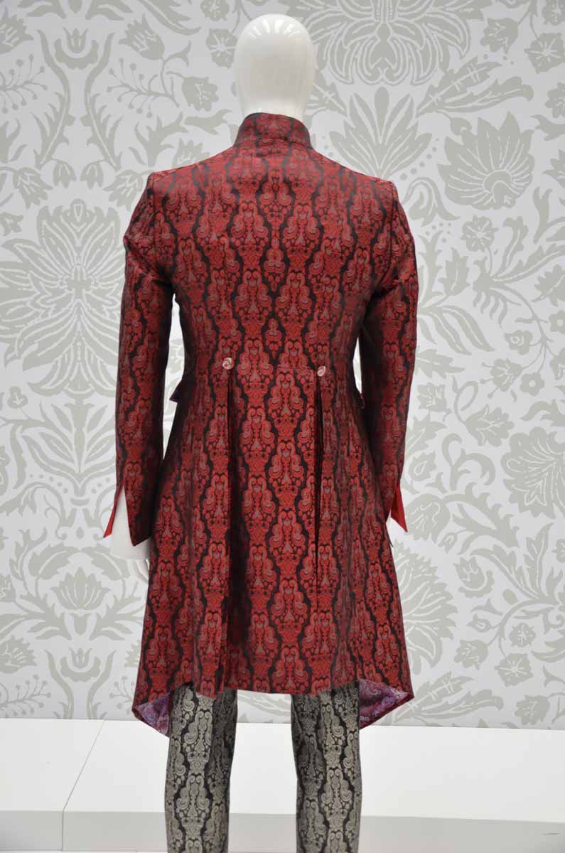 Giacca abito da uomo lusso glamour monopetto uomo linea marsina Limited Edition da poter indossare in qualunque occasione, dalla cerimonia ad un evento di gala, realizzata in un preziosissimo broccato di seta rosso rubino su sfondi nero inchiostro made in Italy 100%. Reinterpretala anche su un jeans.
