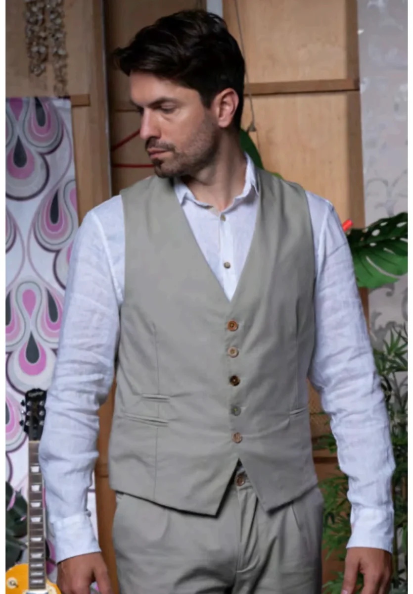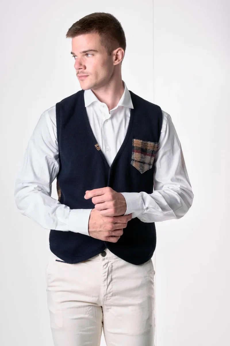 Un gilet dal taglio moderno e deciso, realizzato in tessuto gessato con bottoni dorati effetto vintage che donano un tocco ricercato.