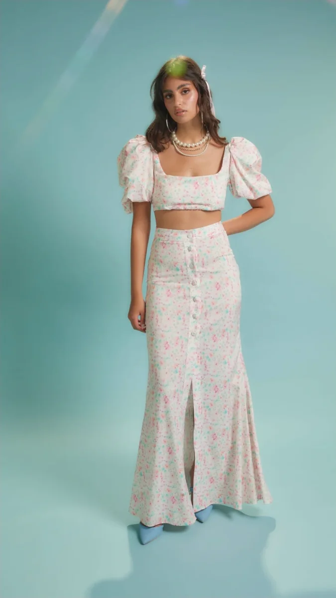 Gonna lunga fantasia, abbottonata davanti, spacco profondo.