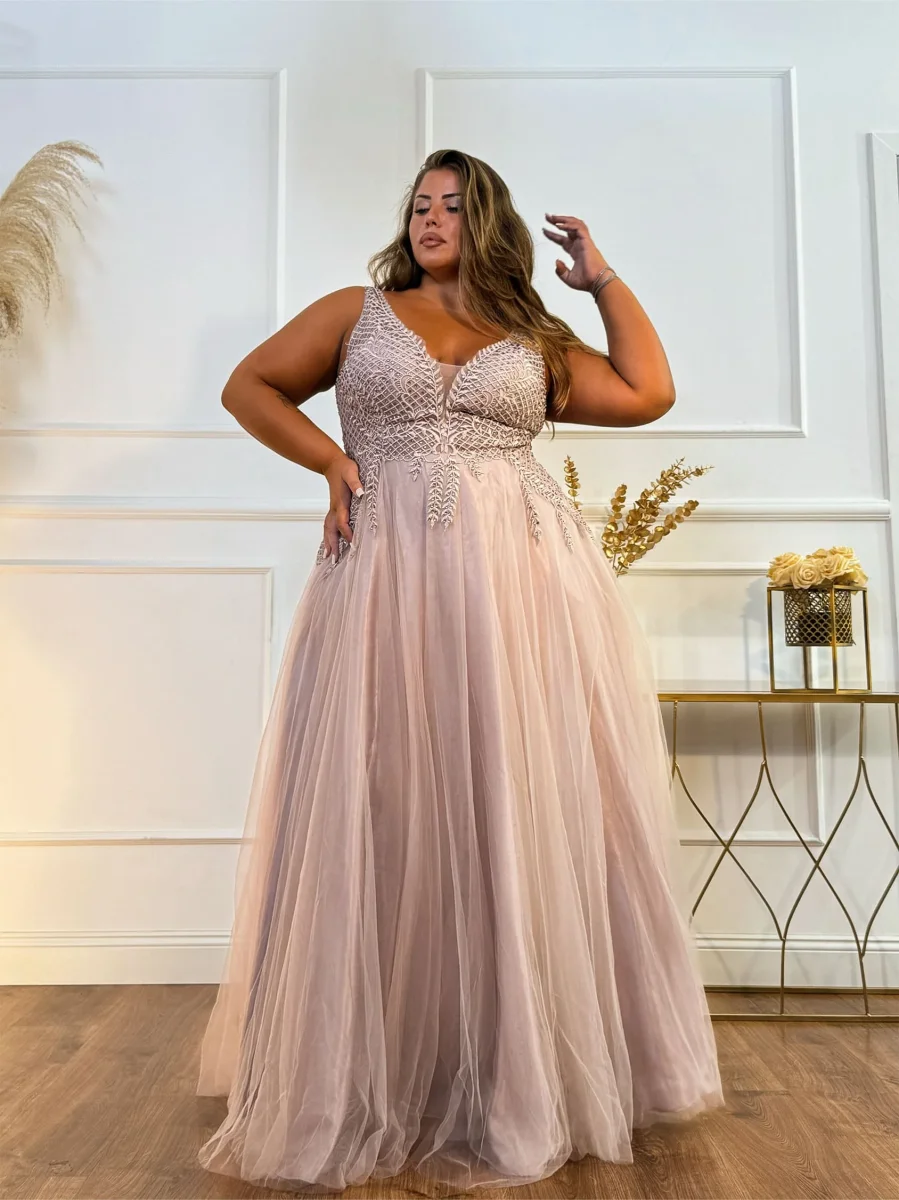Modello: Abito lungo stile principessa, con corpetto ricamato e gonna in tulle ampio. Realizzato in tulle leggero e ricami impreziositi da micro perline tono su tono, combina struttura e fluidità in modo impeccabile. Il corpetto, interamente lavorato con motivi geometrici e floreali, scende morbidamente nella gonna ampia in tulle che crea un movimento elegante ad ogni passo. Lo scollo a V sul davanti e sul retro allunga la figura e aggiunge un tocco di sensualità discreta. L’abito combina romanticismo e femminilità, risultando perfetto per cerimonie, matrimoni, eventi serali o gala.