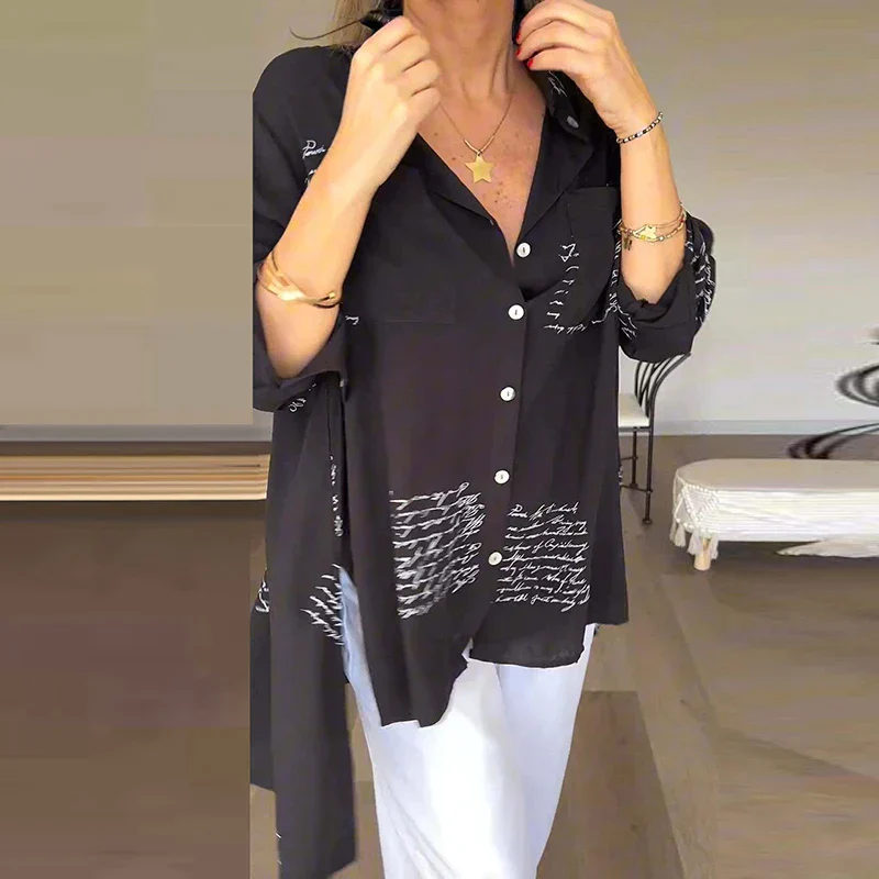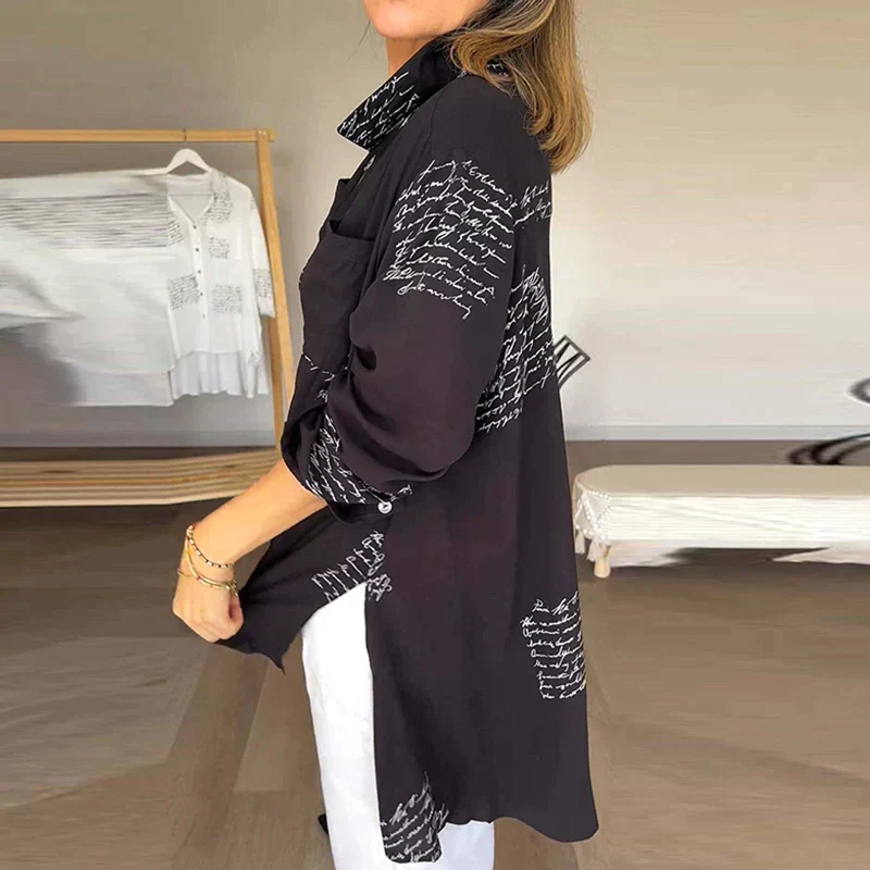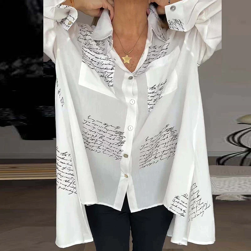 La blusa in lino Helena è ideale per la stagione primavera/estate, con una vestibilità ampia e rilassata per il massimo comfort. Con un motivo a stampa di lettere, questa blusa può essere indossata sia per prestazioni casual che formali.