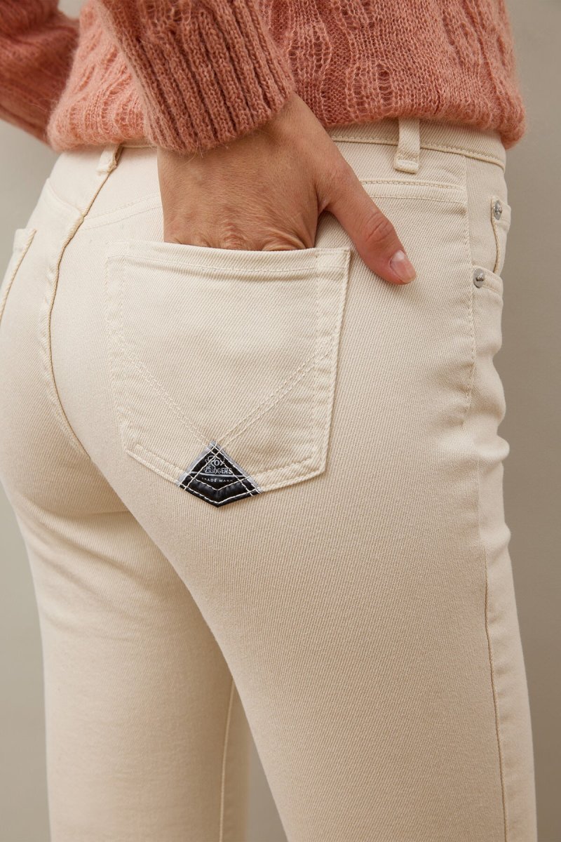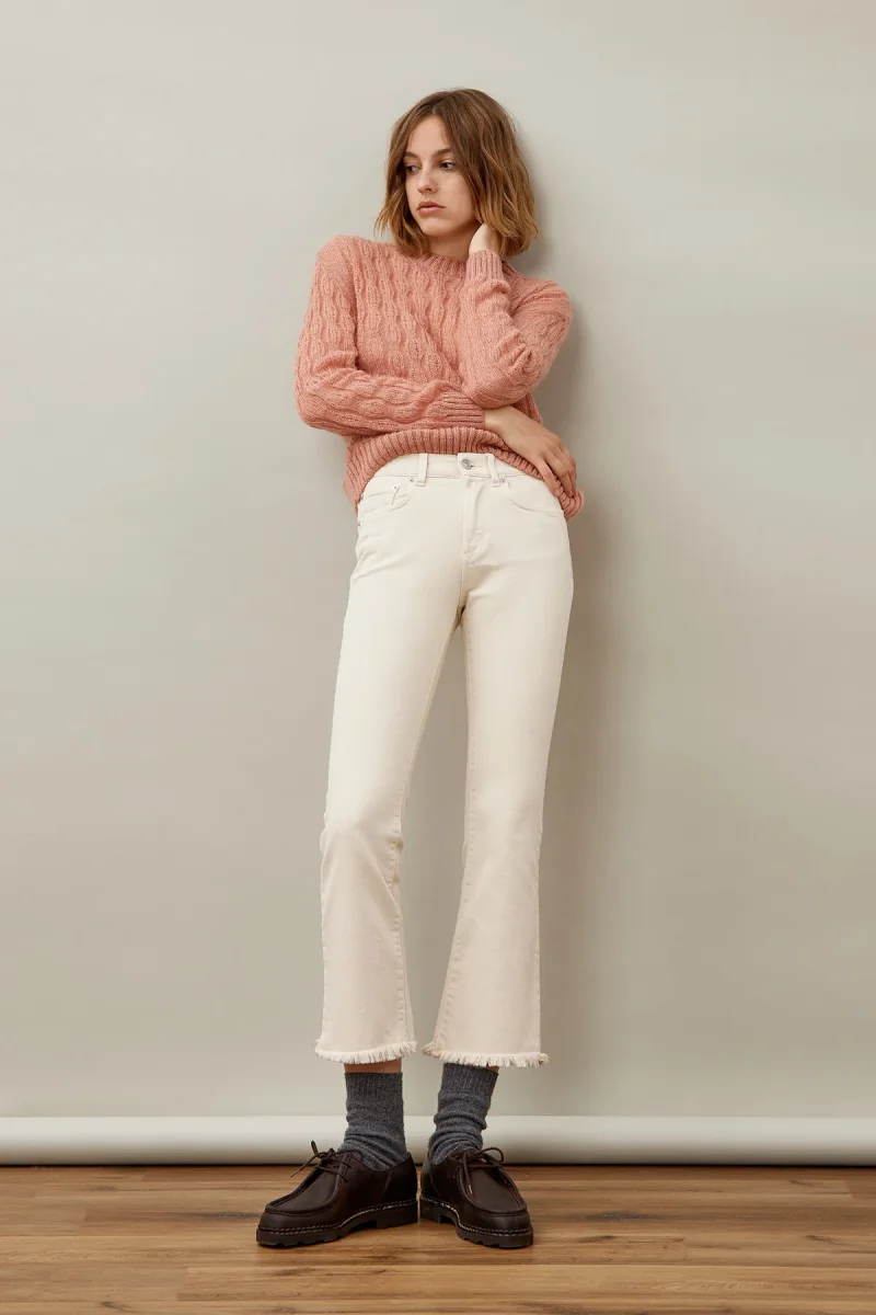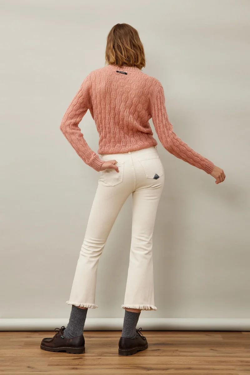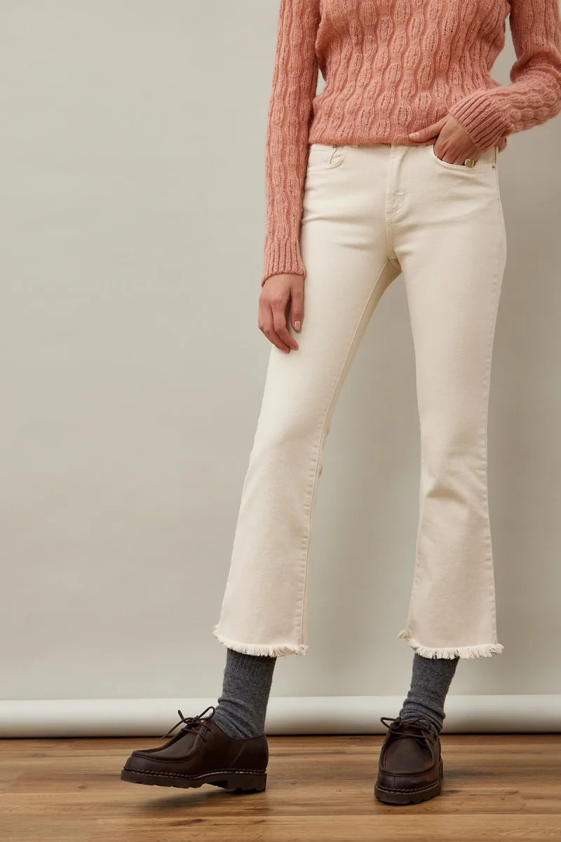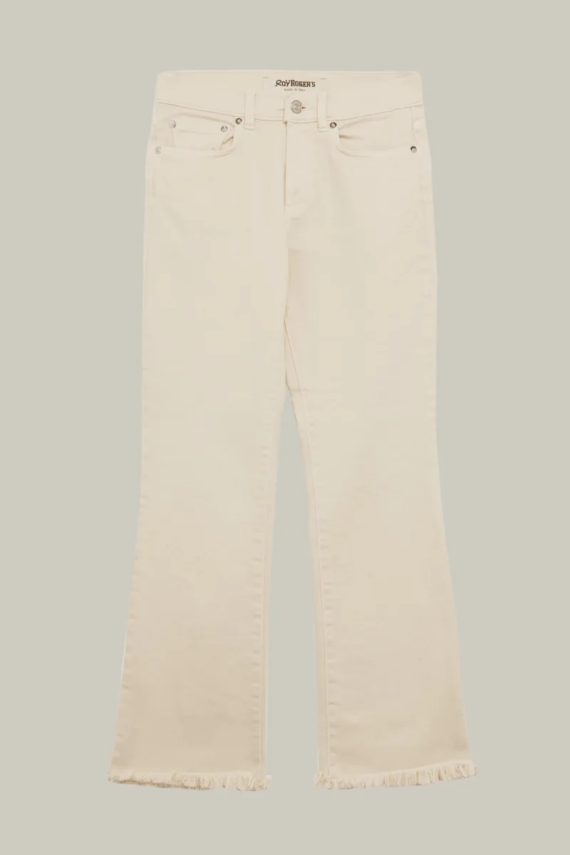 Pantalone di manifattura italiana in denim stone washed. Vita alta con passanti. Chiusura sul fronte con bottone logato e zip. Due tasche sul fronte e due tasche sul retro con label Roy Roger’s applicato. Effetto sfrangiato sul fondo. Bootcut flare fit. COMPOSIZIONE: 99% COTONE 1% ELASTAN. La modella è alta 178 cm.