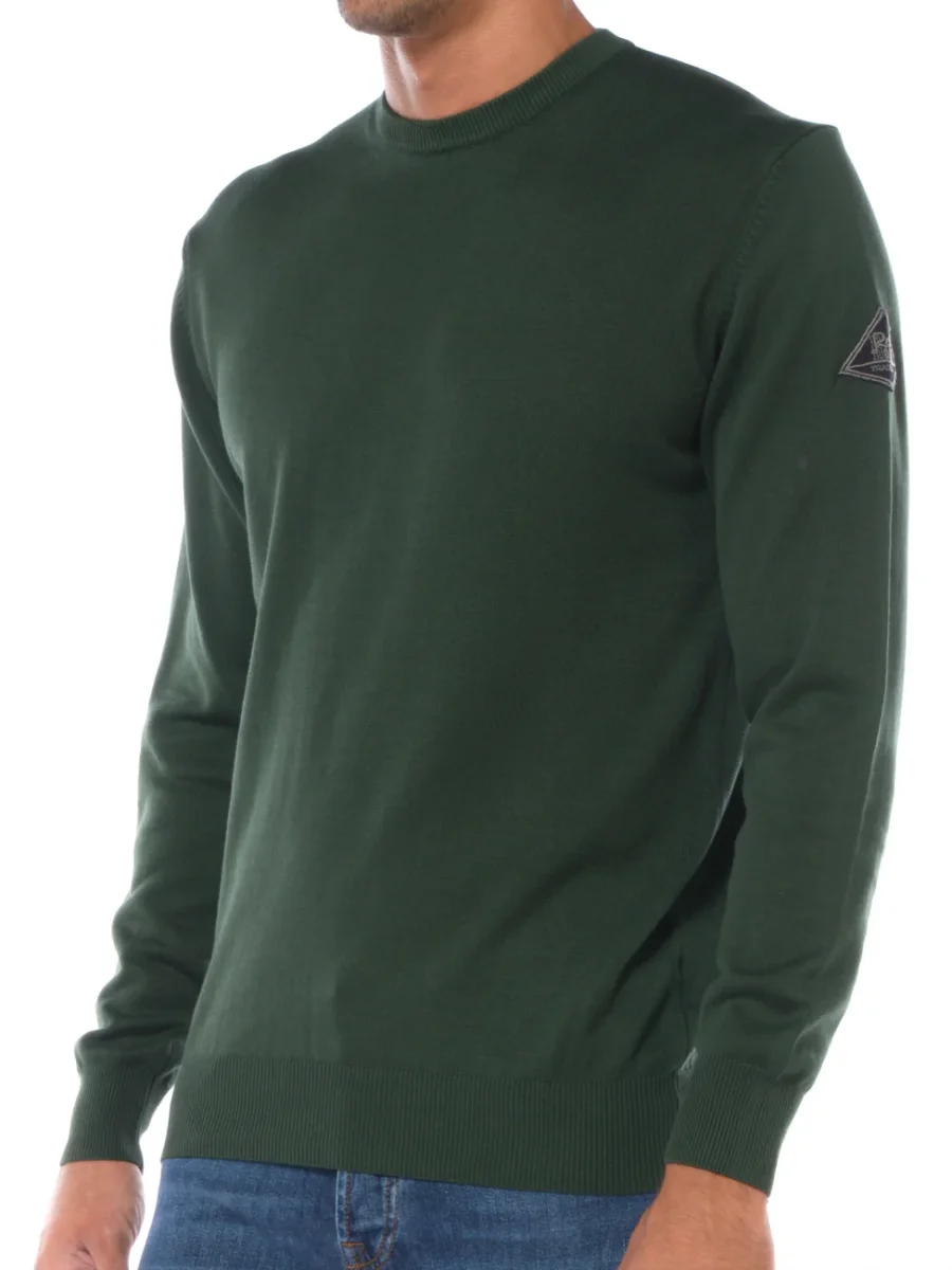 Maglia in cotone con logo in tessuto a contrasto colore applicato su manica sinistra, girocollo, manica lunga, rovescino su collo, polsi e fondo.