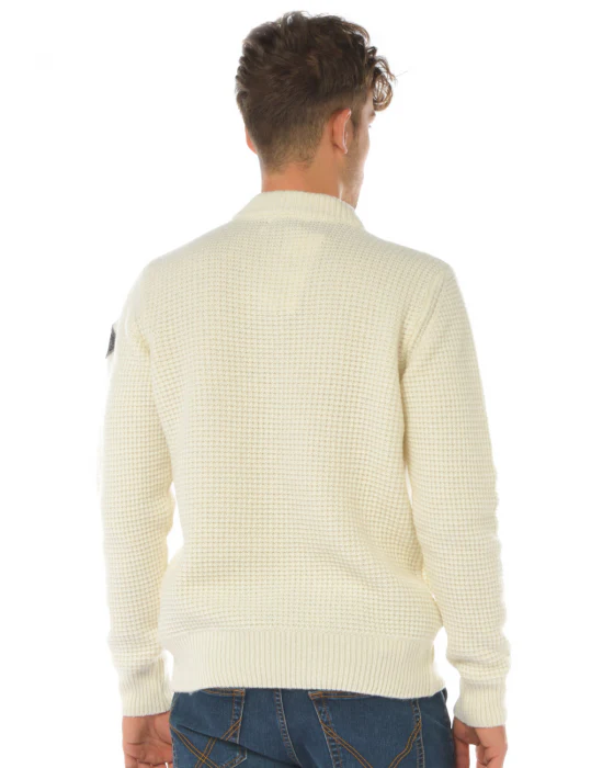 Maglia girocollo con lavorazione operata a trama grossa, logo in tessuto in contrasto colore ricamato su spalla sinistra, rovescino su polsi e fondo. Composizione: 45% lana 25% poliammide 25% viscosa 5% cachemire. Made in Italy