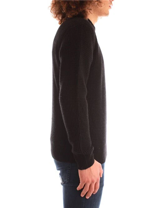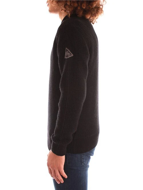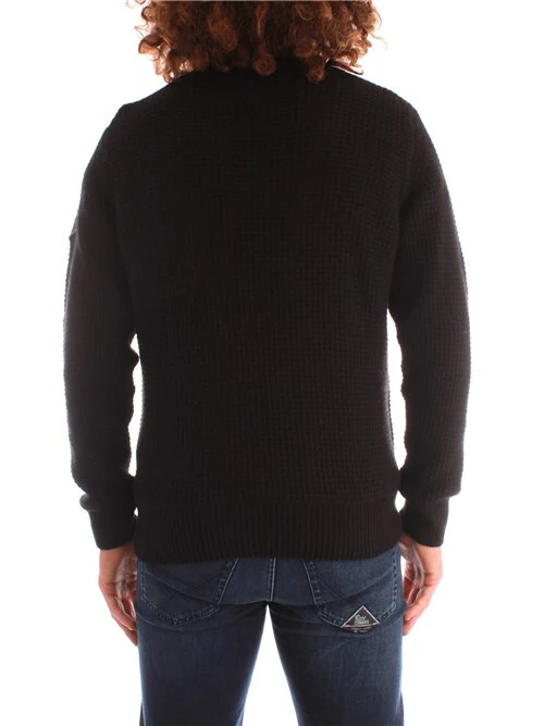 Maglia girocollo con lavorazione operata a trama grossa, logo in tessuto in contrasto colore ricamato su spalla sinistra, rovescino su polsi e fondo. Composizione: 45% lana 25% poliammide 25% viscosa 5% cachemire. Made in Italy