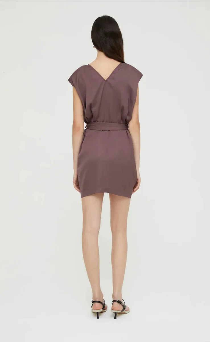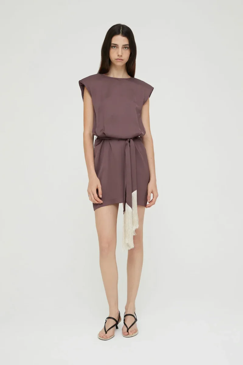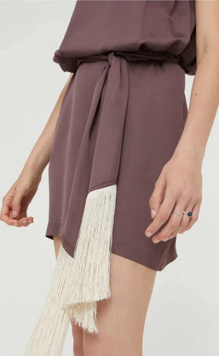MINI ABITO IN CREPE DI VISCOSA CON CINTURA INSERTO FRANGE IN VISCOSA.