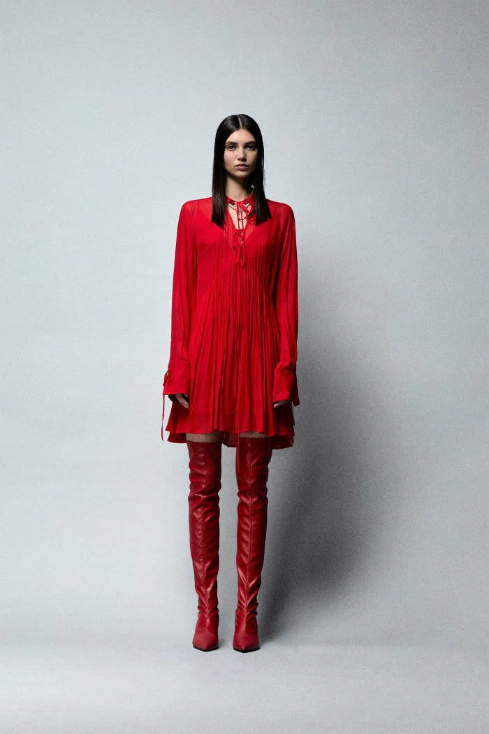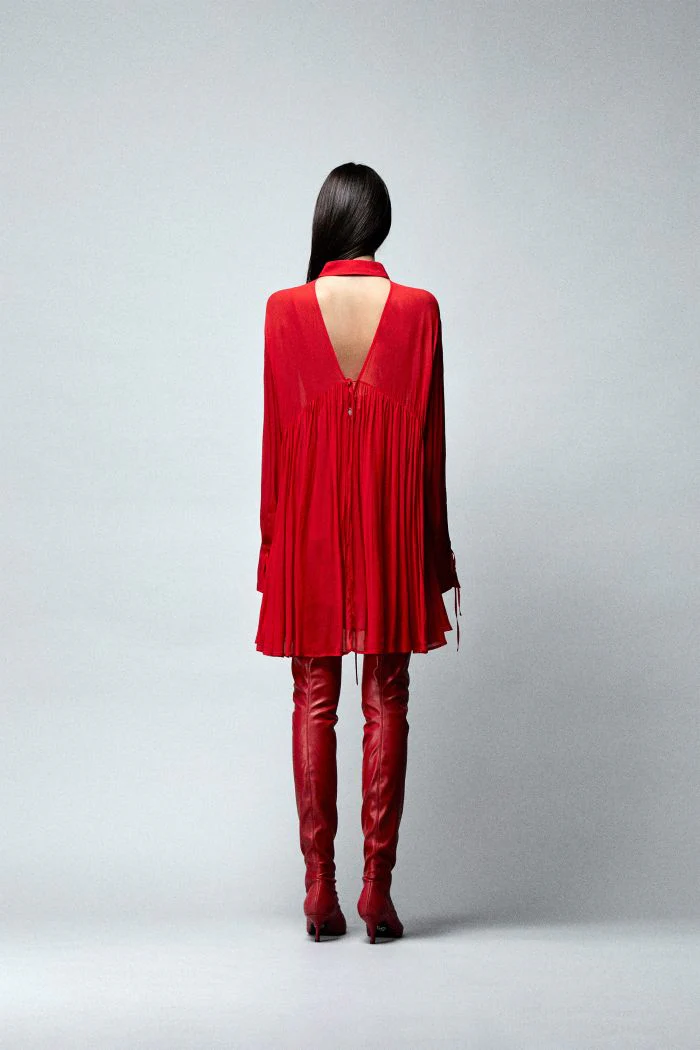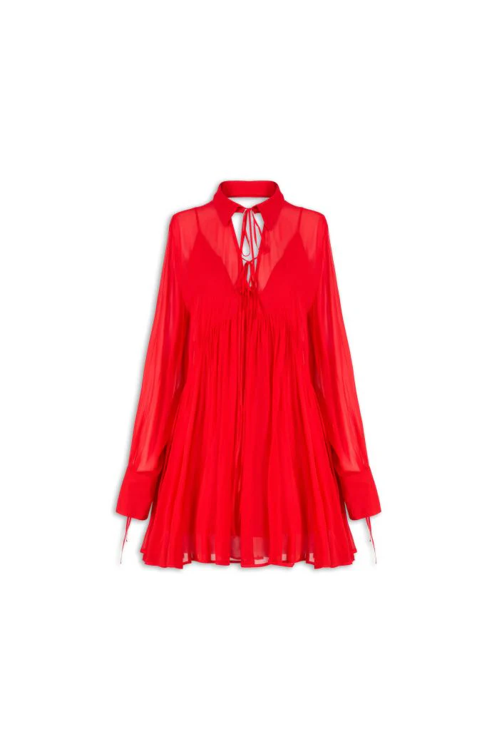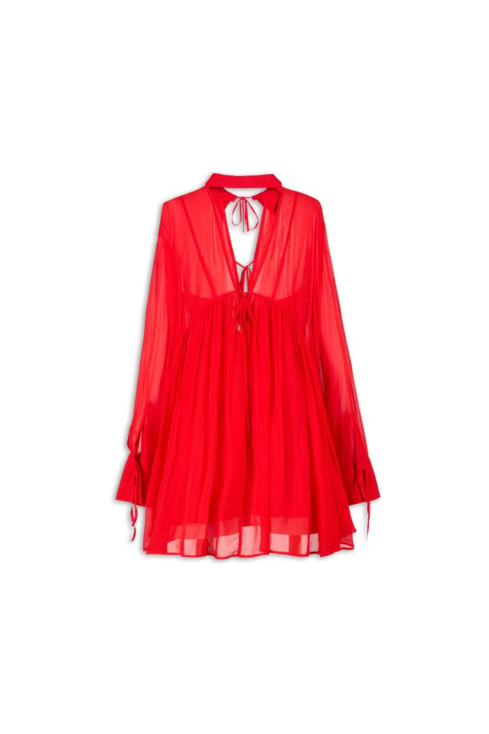 ABITO CORTO IN GEORGETTE DI VISCOSA. CAPO A MANICHE LUNGHE, DALLA LINEE MORBIDE E DA UN FONDO SVASATO. DETTAGLIATO DA UN COLLETTO SIMIL CAMICIA E DA UN AMPIA SCOLLATURA IN PARTE RICHIUSA DA LUNGHI LACCETTI CHE CONSENTONO DI REALIZZARE FIOCCHETTI FRONTALI, MENTRE LA SCHIENA RIMANE CON LA MEDESIMA SCOLLATURA APERTA.
