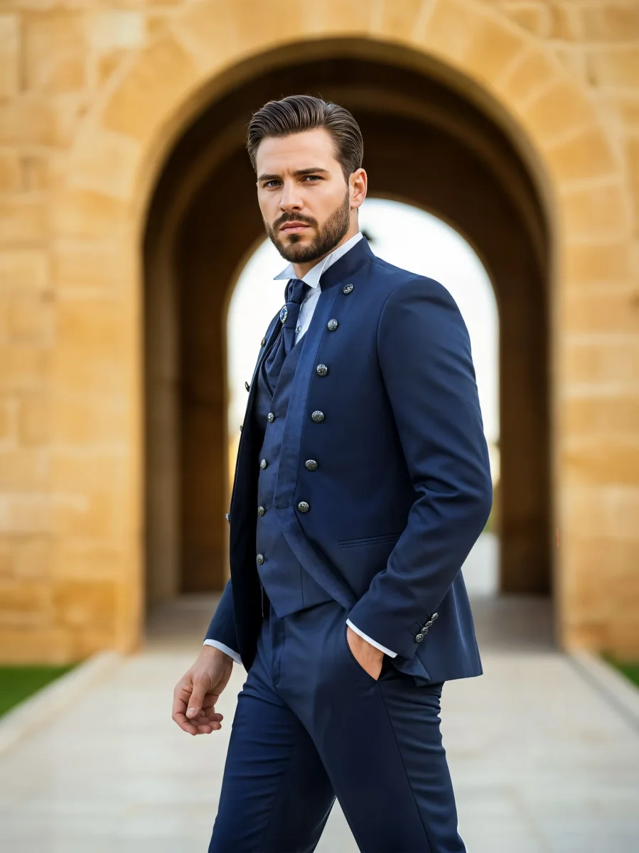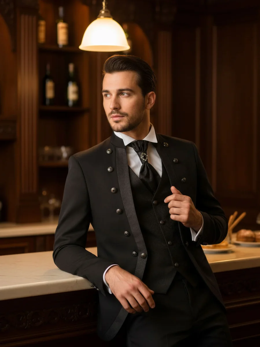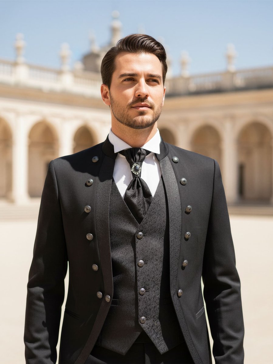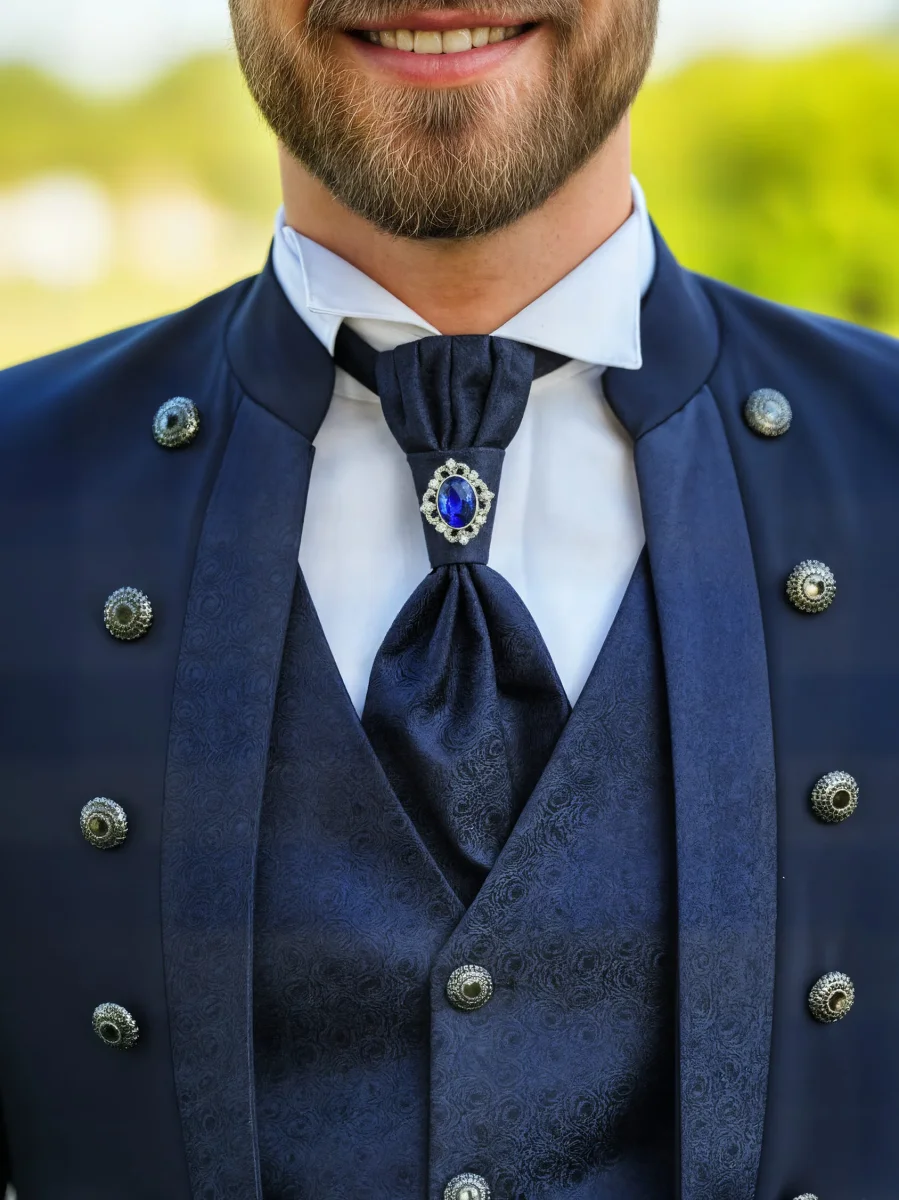 Modello: Abito modello coreano. La giacca è arricchita dall’applicazione di bottoni gioiello, che si trovano anche sul gilet correlato. Mentre il plastron presenta una spilla che gli conferisce luminosità ed eleganza allo stesso tempo. Il pantalone è classico con taglio dritto
