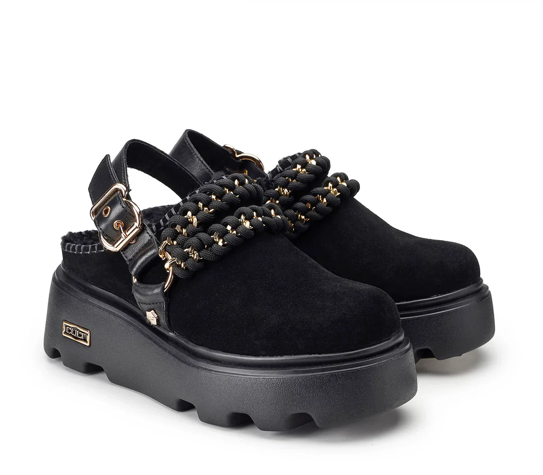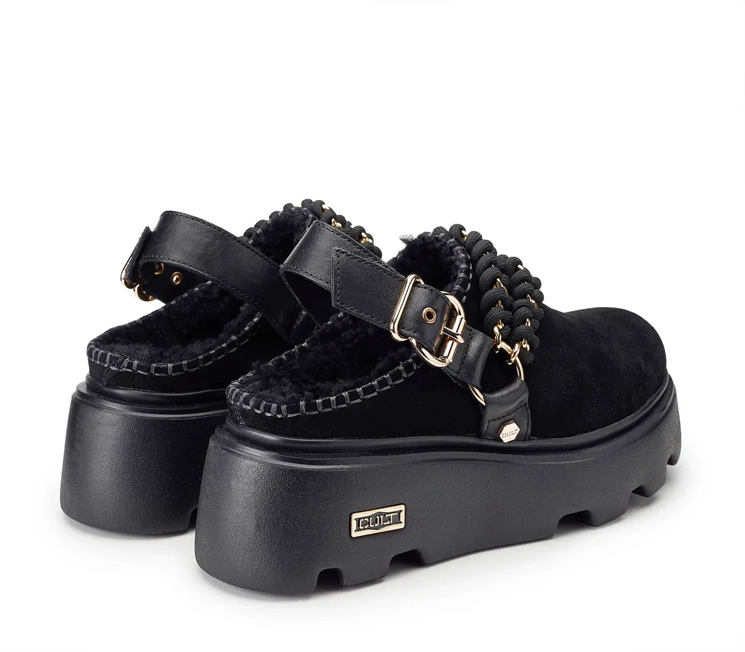 Aggiungi un tocco rock ai tuoi outfit con questi comodi sabot platform foderati in morbido shearling con la punta tonda firmati Cult.