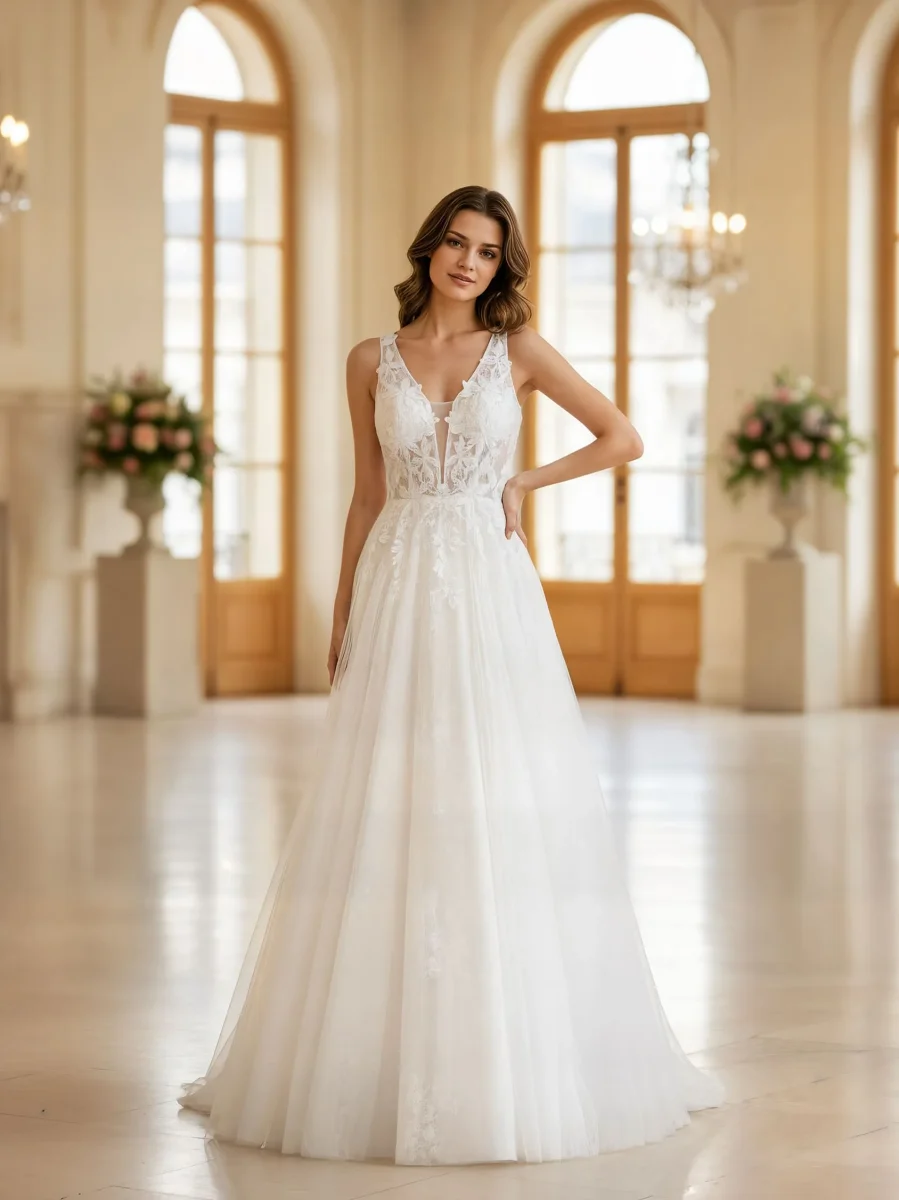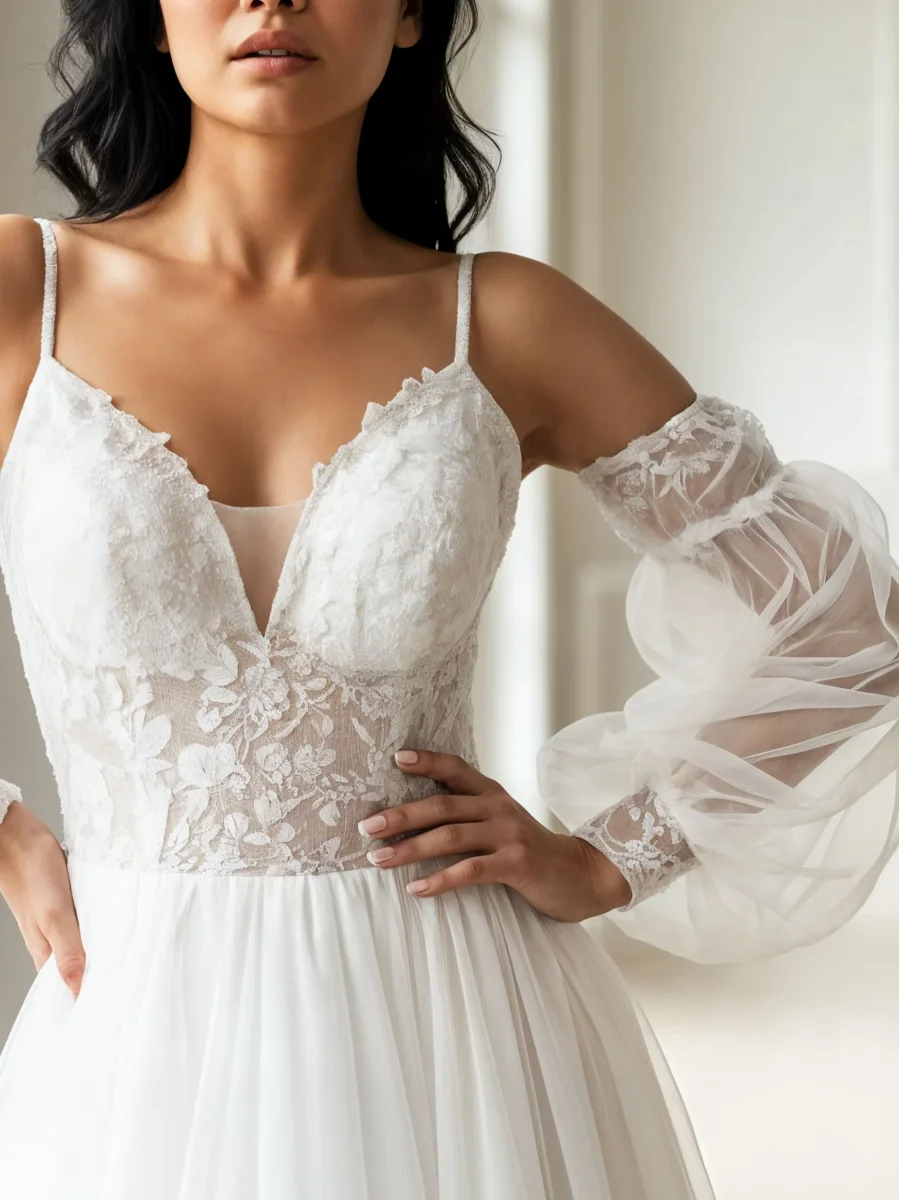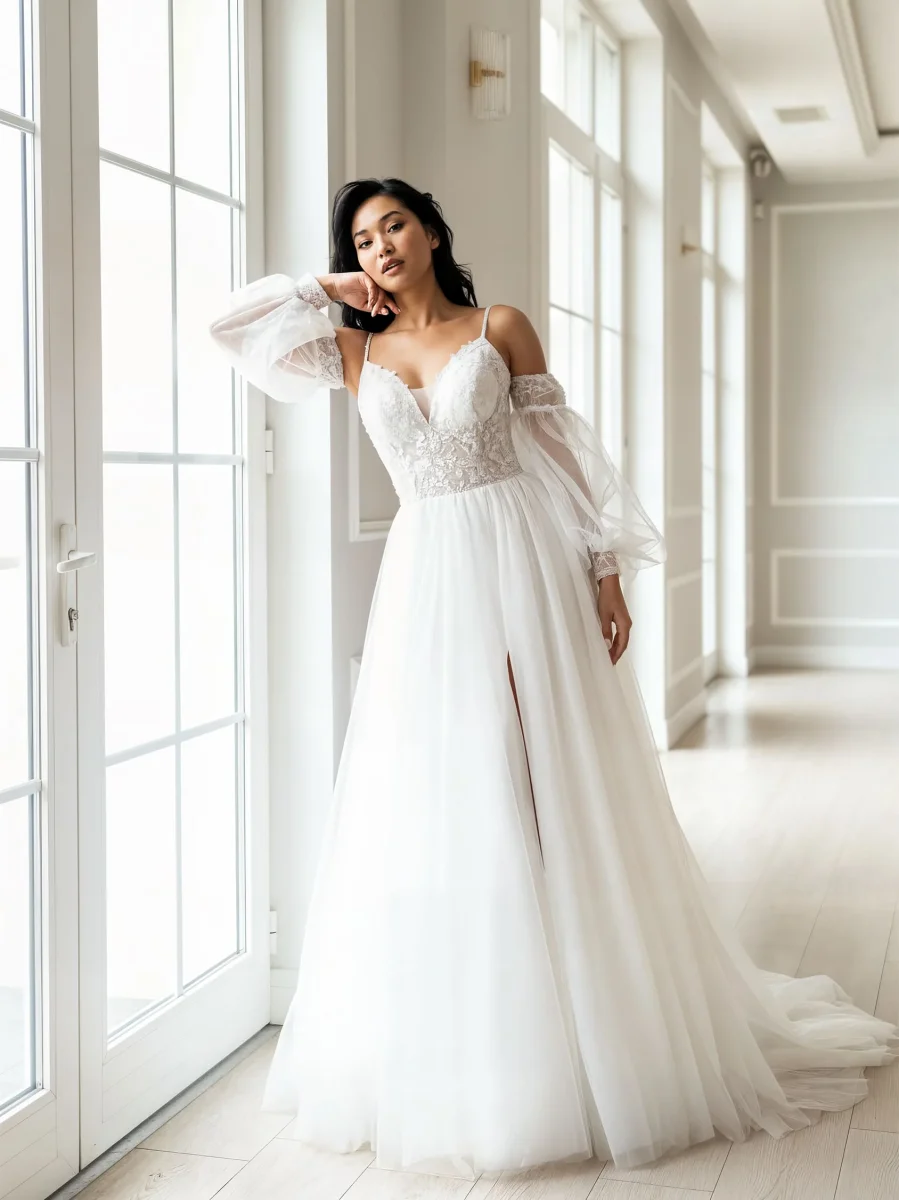 Modello: Abito da sposa che combina romanticismo e modernità con dettagli unici. Il corpetto ricamato si adagia delicatamente sul busto, valorizzando il décolleté con una scollatura profonda e spalline sottili. Le maniche in tulle removibili, ampie e vaporose, aggiungono un tocco di teatralità e raffinatezza. La gonna leggera scivola fluida, arricchita da un delicato spacco che dona movimento e femminilità. Perfetto per una sposa che desidera un look sofisticato e sorprendente.