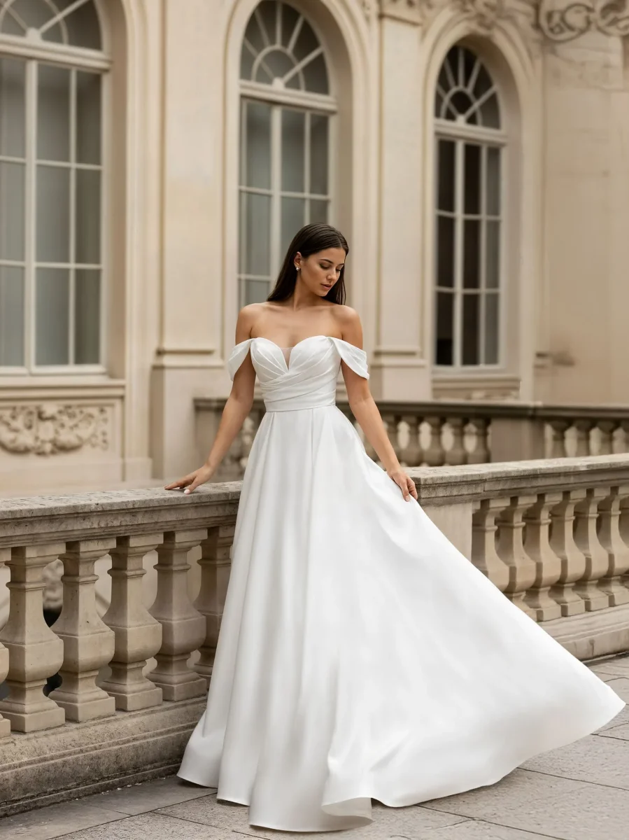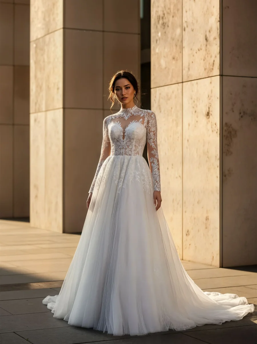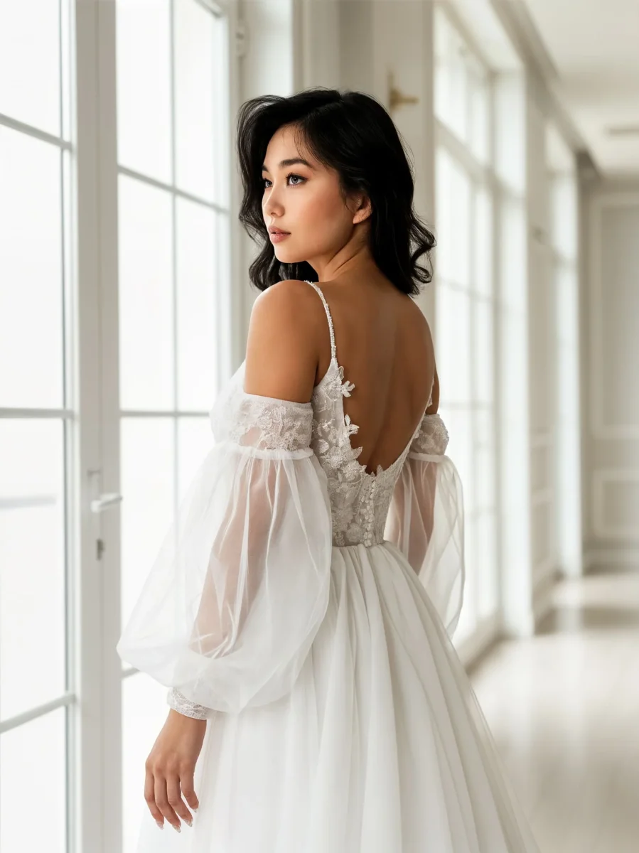 Modello: Abito da sposa che combina romanticismo e modernità con dettagli unici. Il corpetto ricamato si adagia delicatamente sul busto, valorizzando il décolleté con una scollatura profonda e spalline sottili. Le maniche in tulle removibili, ampie e vaporose, aggiungono un tocco di teatralità e raffinatezza. La gonna leggera scivola fluida, arricchita da un delicato spacco che dona movimento e femminilità. Perfetto per una sposa che desidera un look sofisticato e sorprendente.