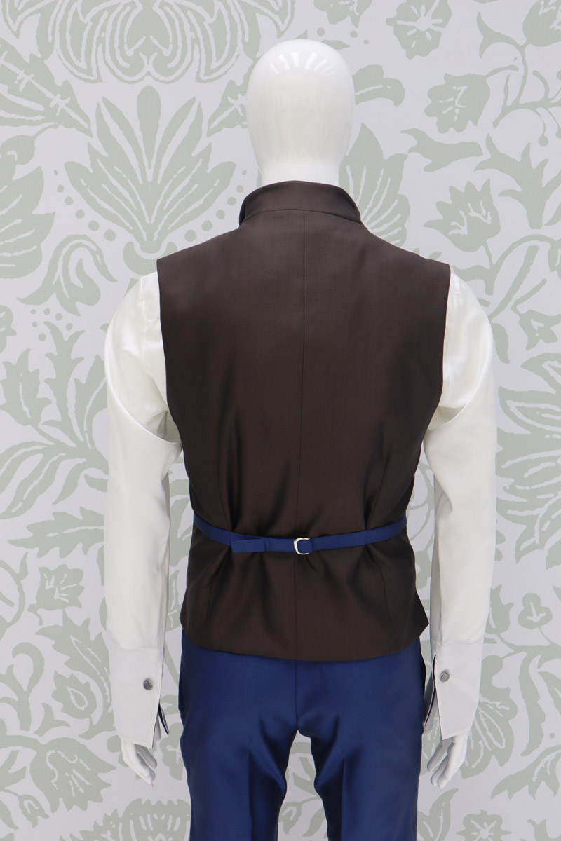 Panciotto sposo glamour dal fondo dritto e leggermente stondato, con collo alto da poter risvoltare a scialle, realizzato in raso di lana seta tinto filo marrone freddo made in Italy 100%, con l’interno del collo e la fettuccia posteriore che regola la larghezza del gilet che contrastano con un raso di lana seta tinto filo blu lampo intenso.