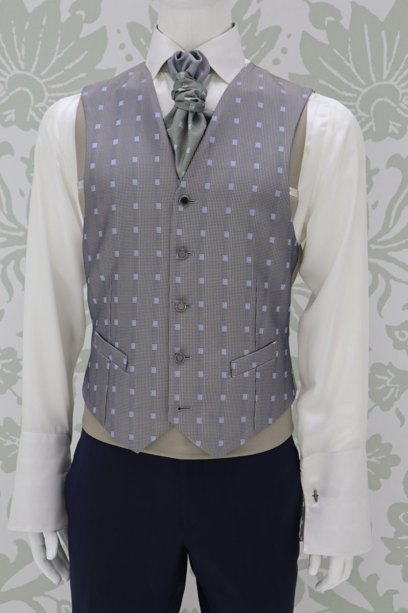 Il panciotto da sposo e cerimonia uomo Cleofe Finati in broccato 100% seta presenta un raffinato micro-disegno geometrico con quadretti azzurro polvere su fondo grigio perla, esaltato dal retro in tinta sabbia, quasi a richiamare la sabbia e le superfici naturali.