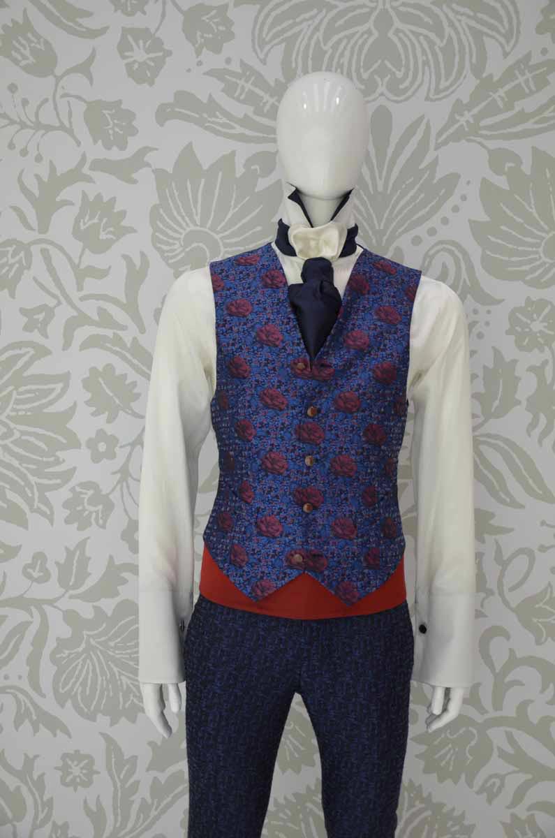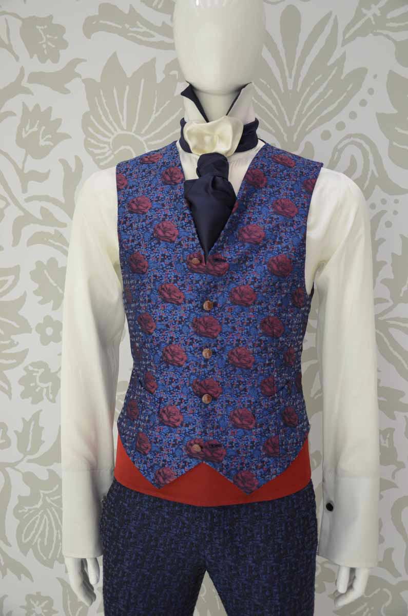 Panciotto uomo glamour in broccato jacquard made in Italy 100% in seta e lana, con una minima percentuale sintetica (pa10%), dall’effetto tassellato, grazie ad un gioco di passaggi di armature reso volumetrico dall’inserzione di un filo bouclè che gonfia il tessuto senza appesantirlo. Un effetto a mosaico irregolare che cosparge rose color rosa anticato da una pioggia di tasselli azzurro baltico, sky, blu nay e rosa anticato.