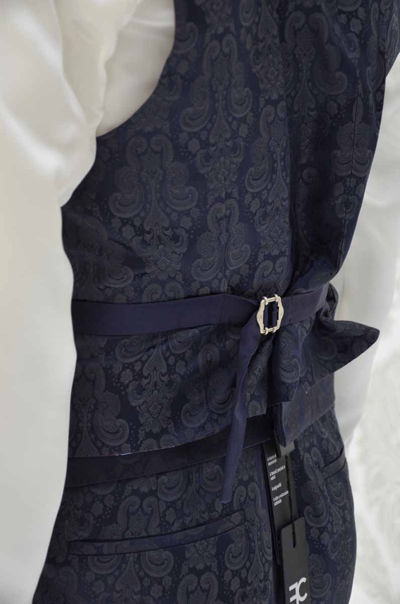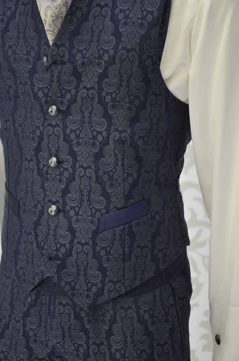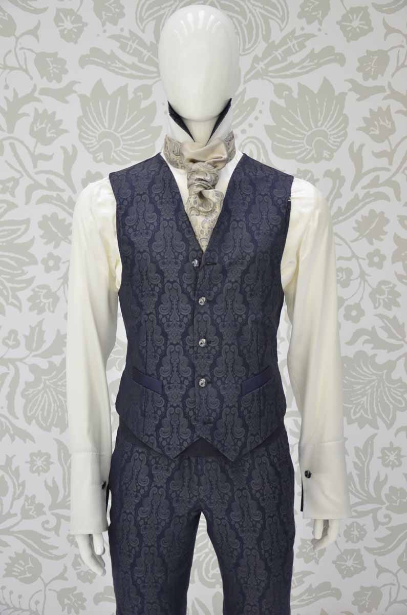 Panciotto uomo glamour Limited Edition ad un petto e mezzo in un prezioso broccato 100% seta made in Italy color blu notte con disegni ombrati, con i filetti, le tasche e la fettuccia posta sulla schiena in un raso di seta che riprende la stessa nota blu notte del broccato.