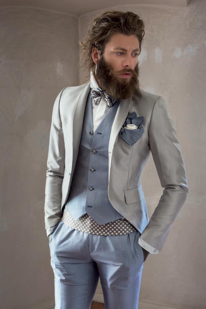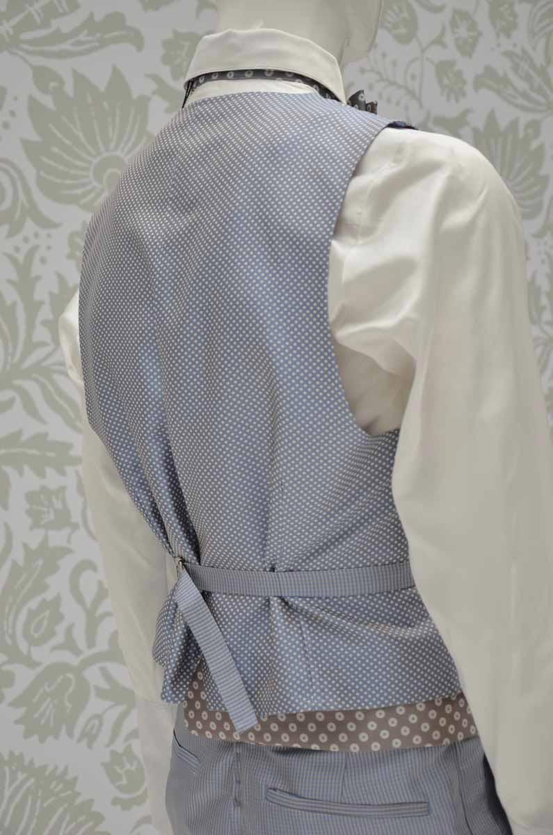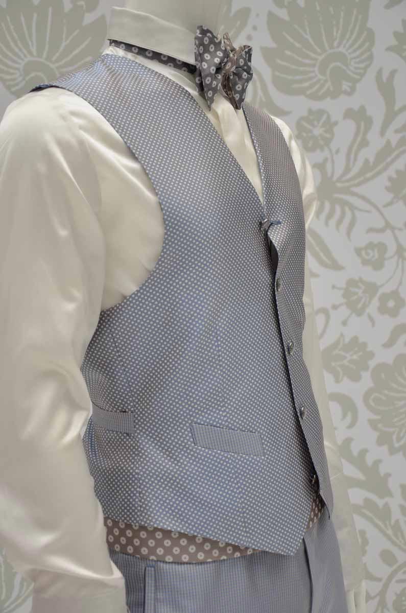 Panciotto uomo glamour in broccato di seta made in Italy 100% in micro pois bianchi su un fondo carta da zucchero, che contrasta con un secondo broccato in seta 100% micro Vichy sabbia e carta da zucchero nei filetti, nelle tasche e nella fettuccia posta sulla schiena.