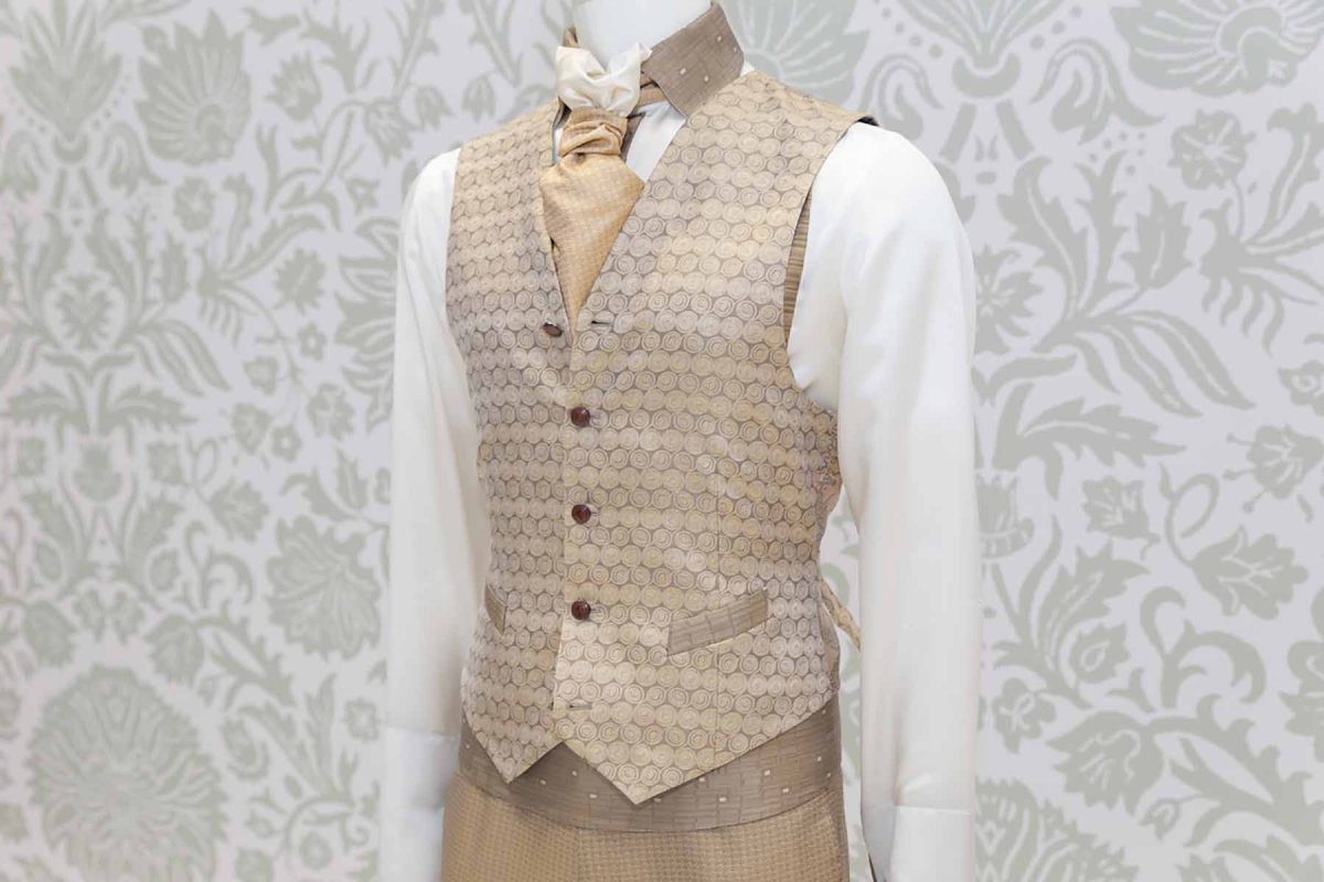 Panciotto uomo glamour Limited Edition in broccato di seta made in Italy 100% con impresso il disegno “The spiral of soul” color miele su fondali noce, in un tripudio di spirali, mentre sulla schiena riporta il disegno “The kiss of lovers” su fondo nattè color miele. Una vera opera d’arte impressa sulla stoffa, ispirata al celebre dipinto “Il bacio” di Gustav Klimt.