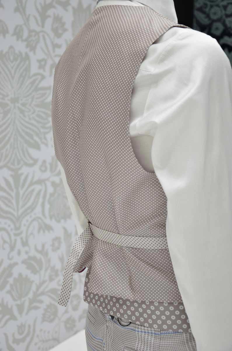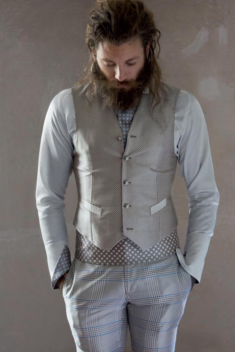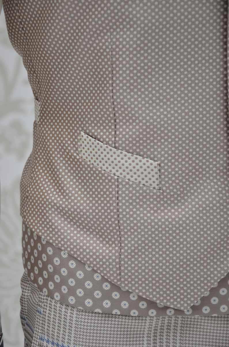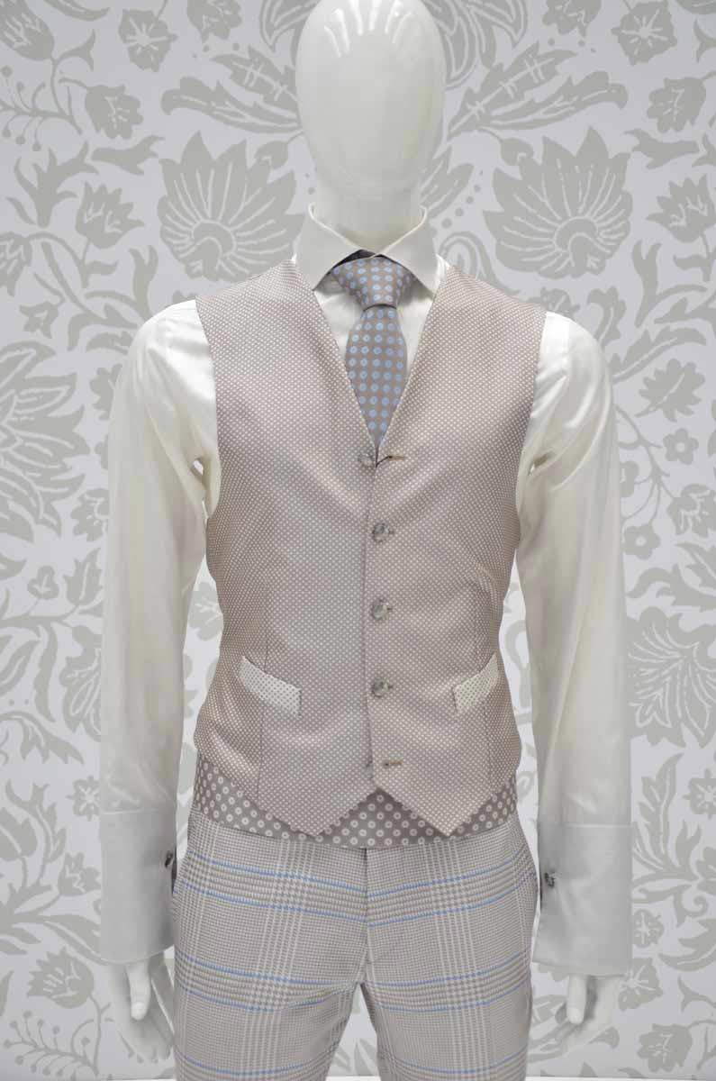 Panciotto uomo glamour in broccato made in italy 100% sabbia, dai riflessi cangianti, solcato da un delicato micro pois bianco, mentre filetti tasche e fettuccia propongono la variante inversa con un broccato bianco a pois sabbia.