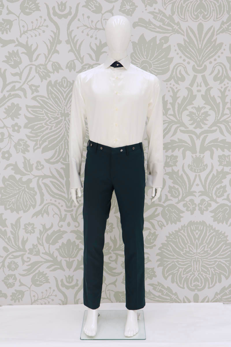 Un pantalone da sposo uomo linea glamour, realizzato con eccellenza sartoriale made in Italy 100%, senza pinces, dalla linea slim slanciato e asciutto, con tasche all’americana. Questo modello, in raso tinto filo di lana, seta ed una piccola percentuale elastica che intreccia filati verde petrolio scuro, disegna il tuo corpo e slancia la tua figura, adattandosi perfettamente alla tua silhouette.