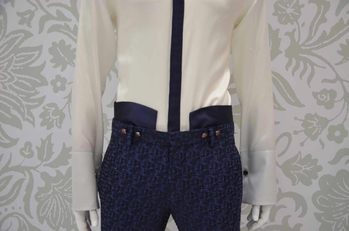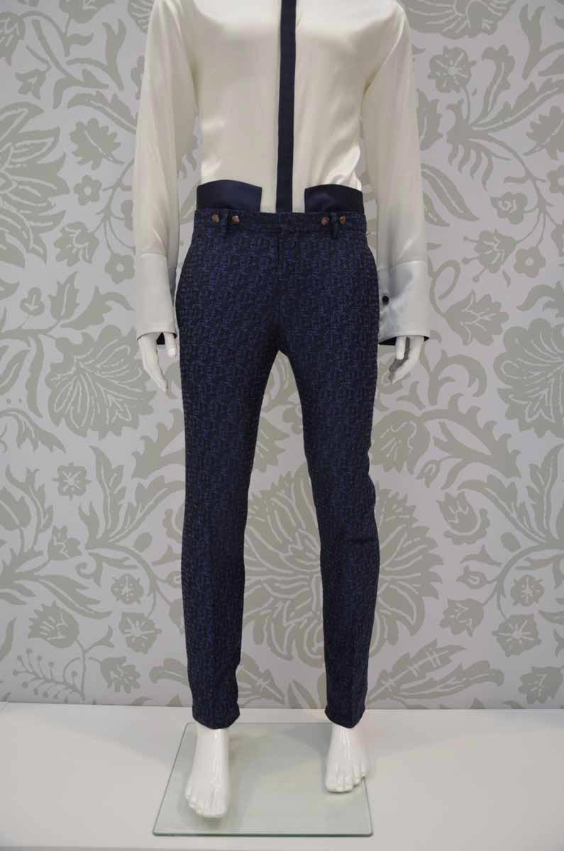 Pantalone abito da uomo glamour blu notte linea fashion a coscia asciutta da poter indossare in qualunque occasione realizzato in broccato di seta made in Italy 100%.