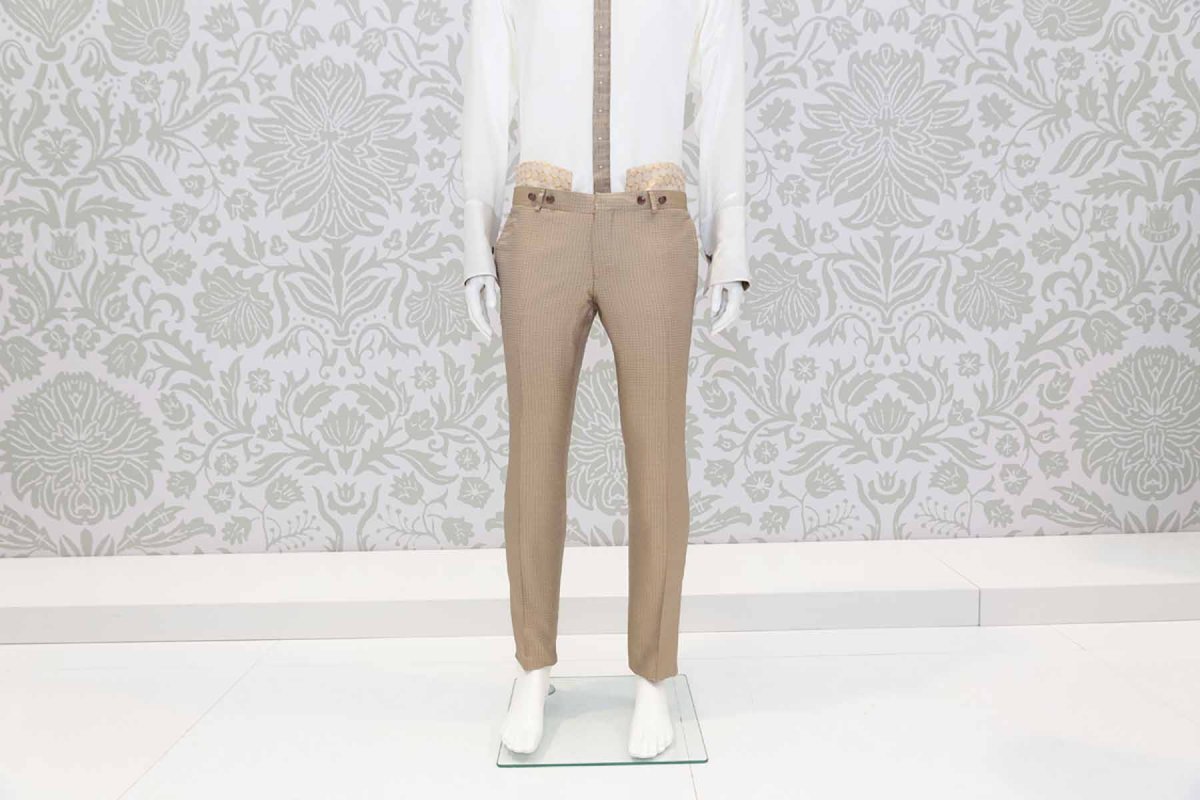 Un pantalone da uomo linea glamour Limited Edition, realizzato con eccellenza sartoriale made in Italy 100%, senza pinces, dalla linea slim slanciato e asciutto, con tasche a doppio filetto. Questo modello, in un meraviglioso broccato 100% seta, con micro fantasia “flower blown” color miele su fondali noce che abbina un cinturino a rimesso interno su tinte bianco panna e miele, attraverso il disegno “The spiral of soul”, disegna il tuo corpo e slancia la tua figura, adattandosi perfettamente alla tua silhouette.