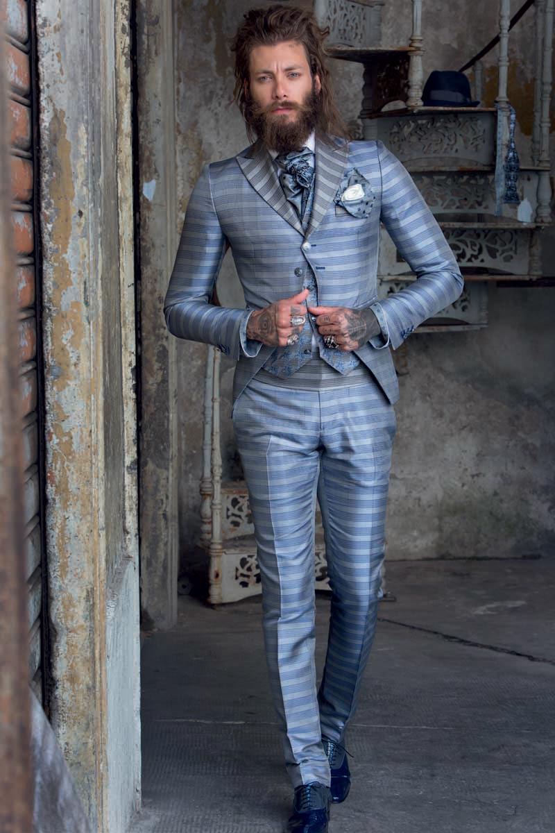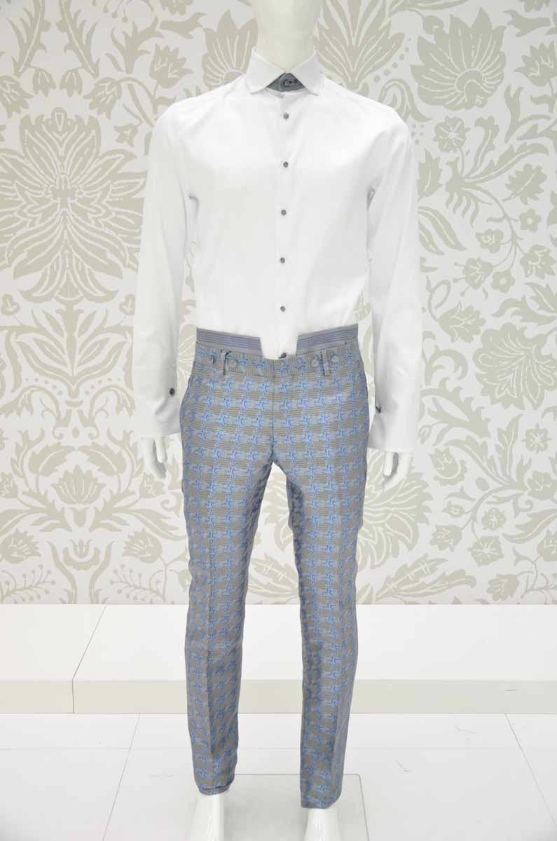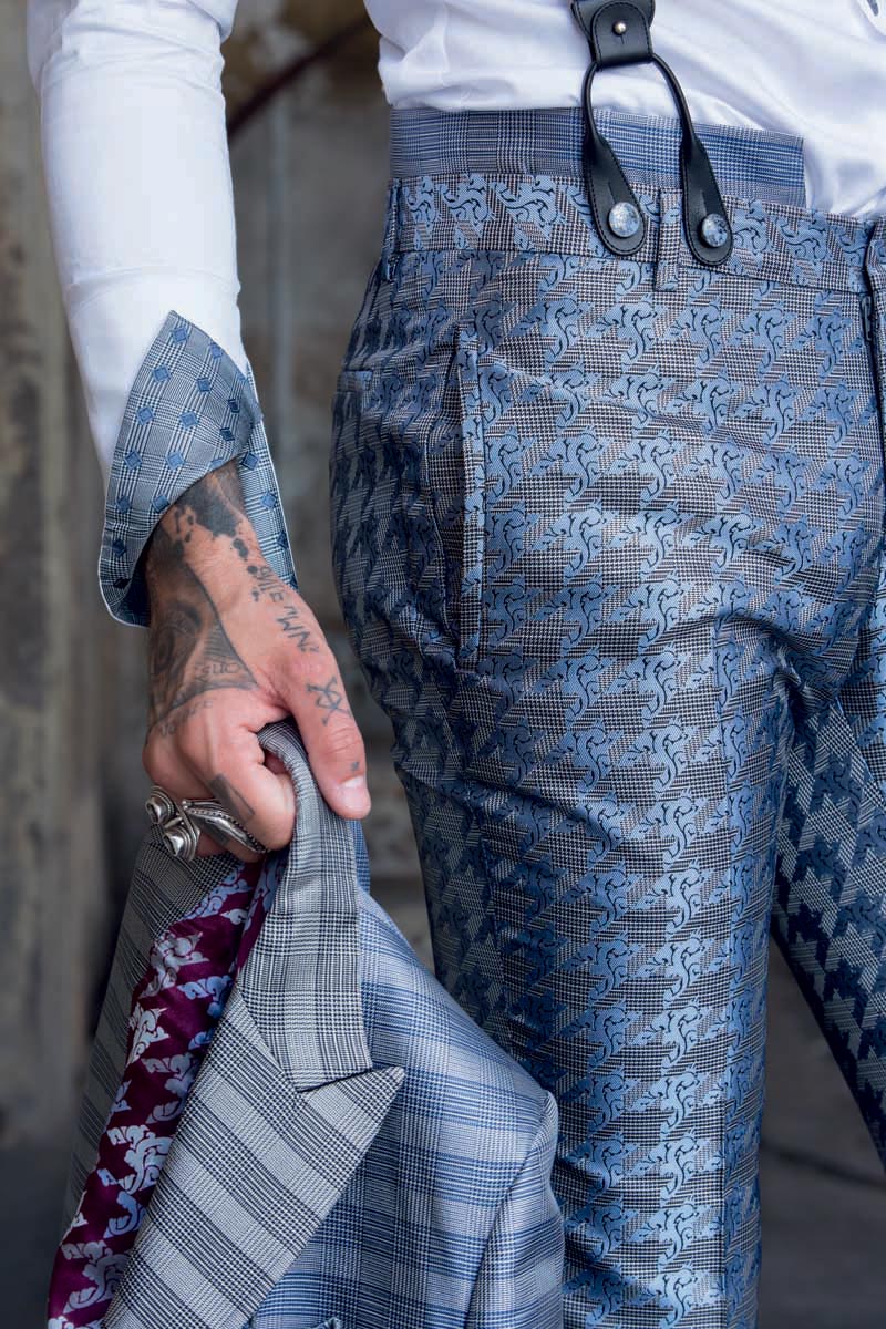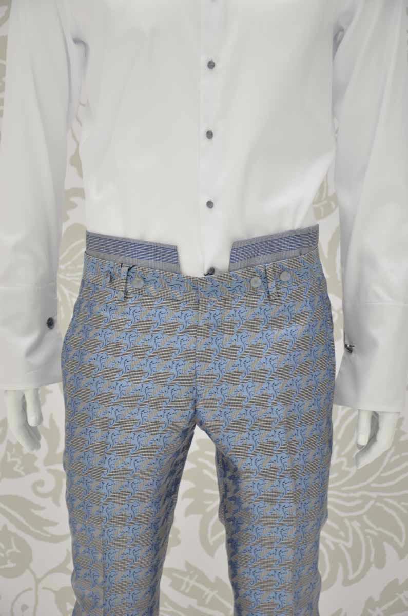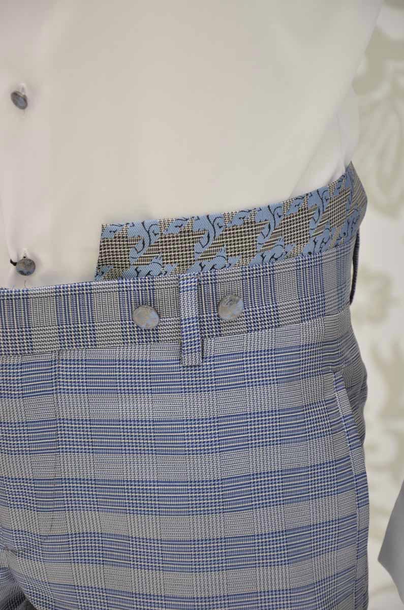 Un pantalone da uomo linea glamour, realizzato con eccellenza sartoriale made in Italy 100%, senza pinces, dalla linea slim slanciato e asciutto, con tasche a doppio filetto. Questo modello, in un Principe di Galles azzurro e blu 100% seta che rivela la variante grigia attraverso il cinturino a rimesso interno, disegna il tuo corpo e slancia la tua figura, adattandosi perfettamente alla tua silhouette.