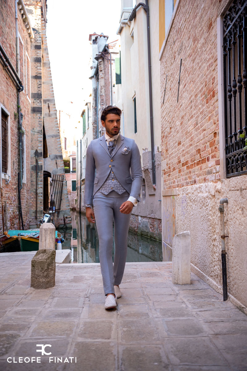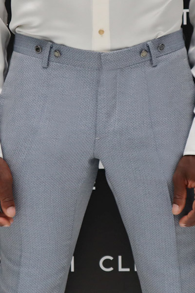 Pantalone abito da uomo glamour azzurro bianco linea fashion a coscia asciutta da poter indossare in qualunque occasione realizzato in broccato di seta made in Italy 100%.