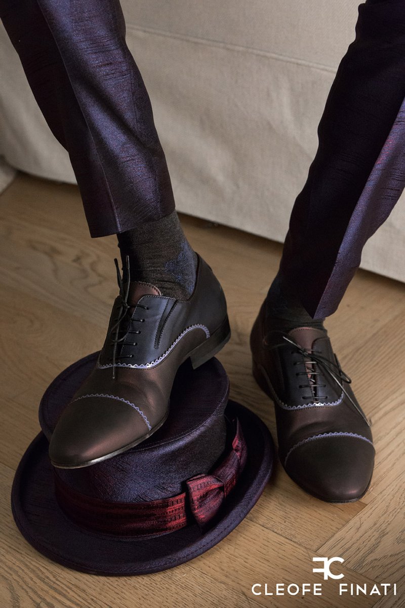 Un pantalone da uomo linea glamour, realizzato con eccellenza sartoriale made in Italy 100%, senza pinces, dalla linea slim slanciato e asciutto, con tasche a doppio filetto. Questo modello è realizzato in un broccato 100% seta, leggero e gradevole al tocco, dall’effetto quasi granuloso e marmorizzato. Nuance blu cobalto sopra a fondali color vinaccia, dall’effetto cangiante e di forte impatto e rivela attraverso il cinturino a rimesso interno una variante più delicata, in nuances azzurre intrecciate al grigio.