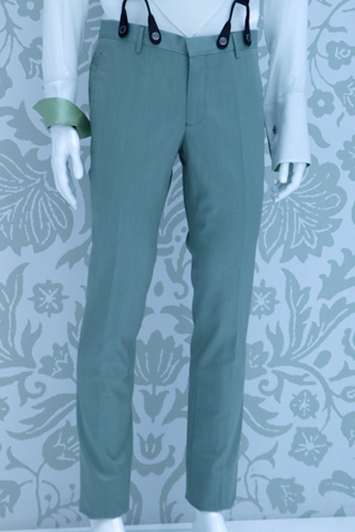Pantalone abito da sposo uomo verde menta linea classica fashion a coscia asciutta da poter indossare in qualunque occasione, realizzato in raso di seta lana made in Italy 100%.