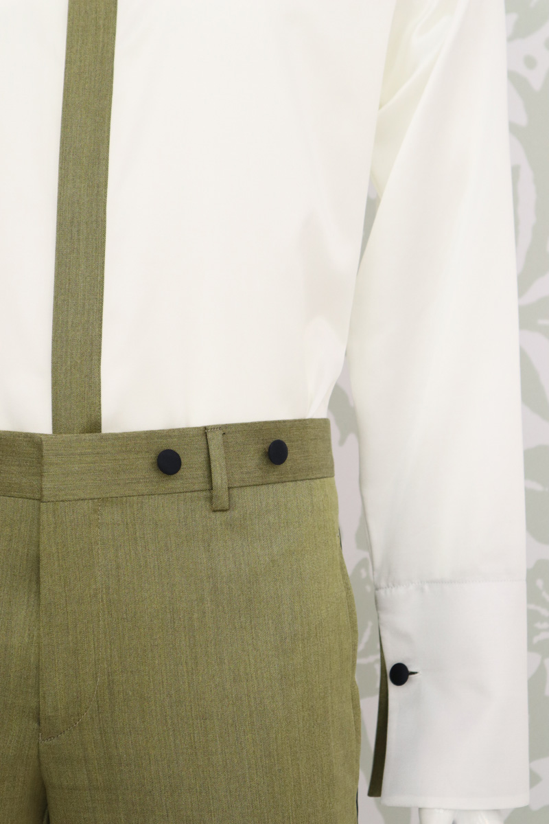 Un pantalone da sposo uomo linea glamour, realizzato con eccellenza sartoriale made in Italy 100%, senza pinces, dalla linea slim slanciato e asciutto, con tasche all’americana. Questo modello, in raso tinto filo di lana e seta nero, con banda laterale in lucente raso nero, disegna il tuo corpo e slancia la tua figura, adattandosi perfettamente alla tua silhouette.
