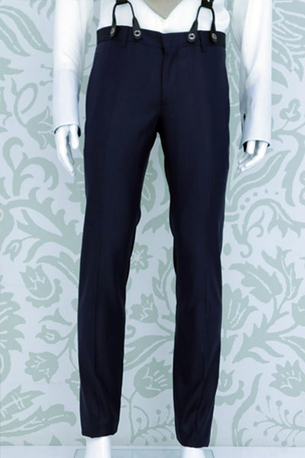 Pantalone abito da sposo uomo blu linea classica fashion a coscia asciutta da poter indossare in qualunque occasione, realizzato in raso di seta lana made in Italy 100%.