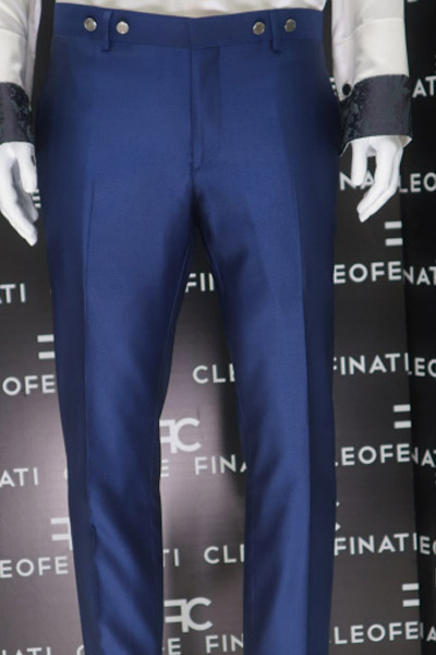 Pantalone abito da sposo uomo blu linea classica fashion a coscia asciutta da poter indossare in qualunque occasione realizzato in raso di seta lana made in Italy 100%.