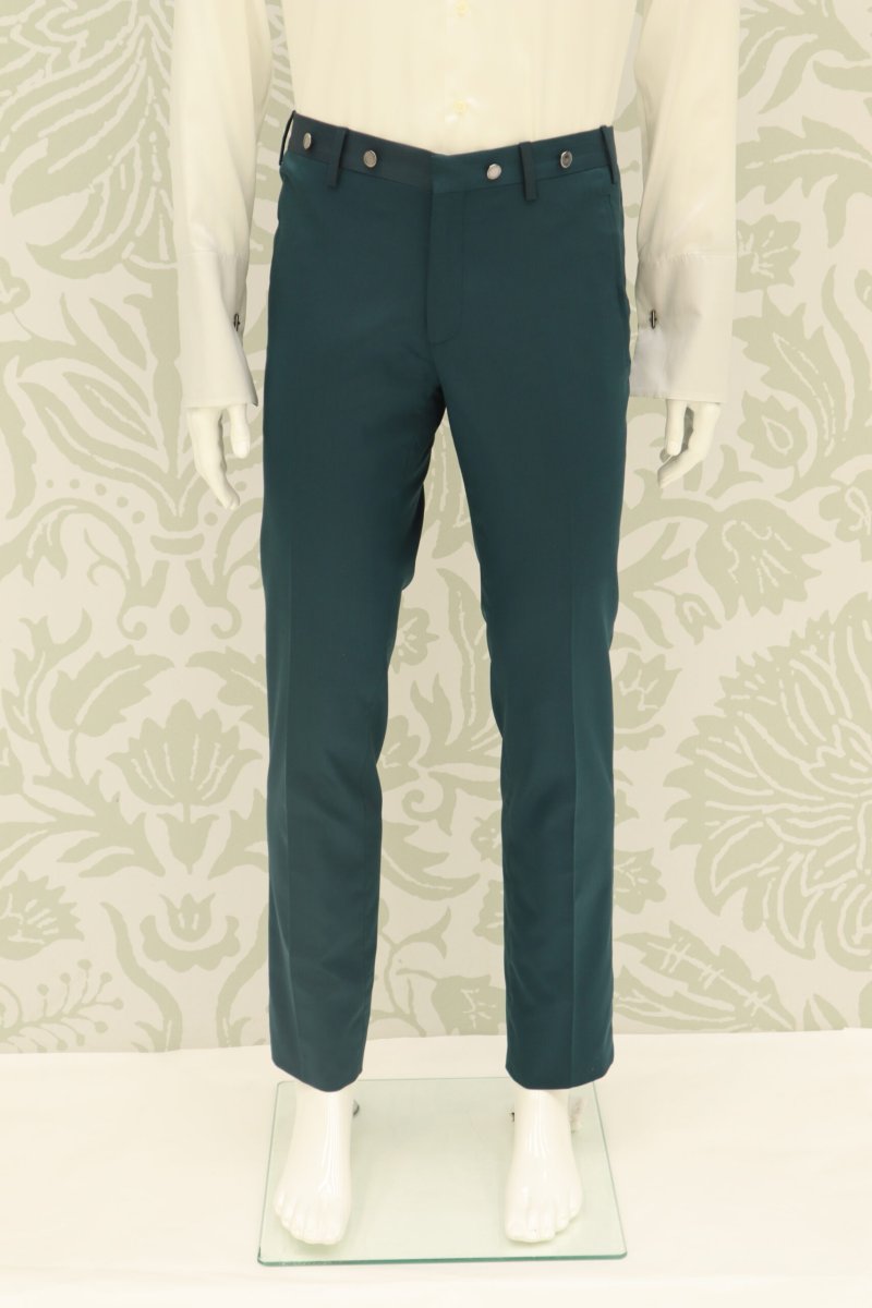 Pantalone abito da sposo uomo verde quercia linea classica fashion a coscia asciutta da poter indossare in qualunque occasione, realizzato in raso di seta lana made in Italy 100%.
