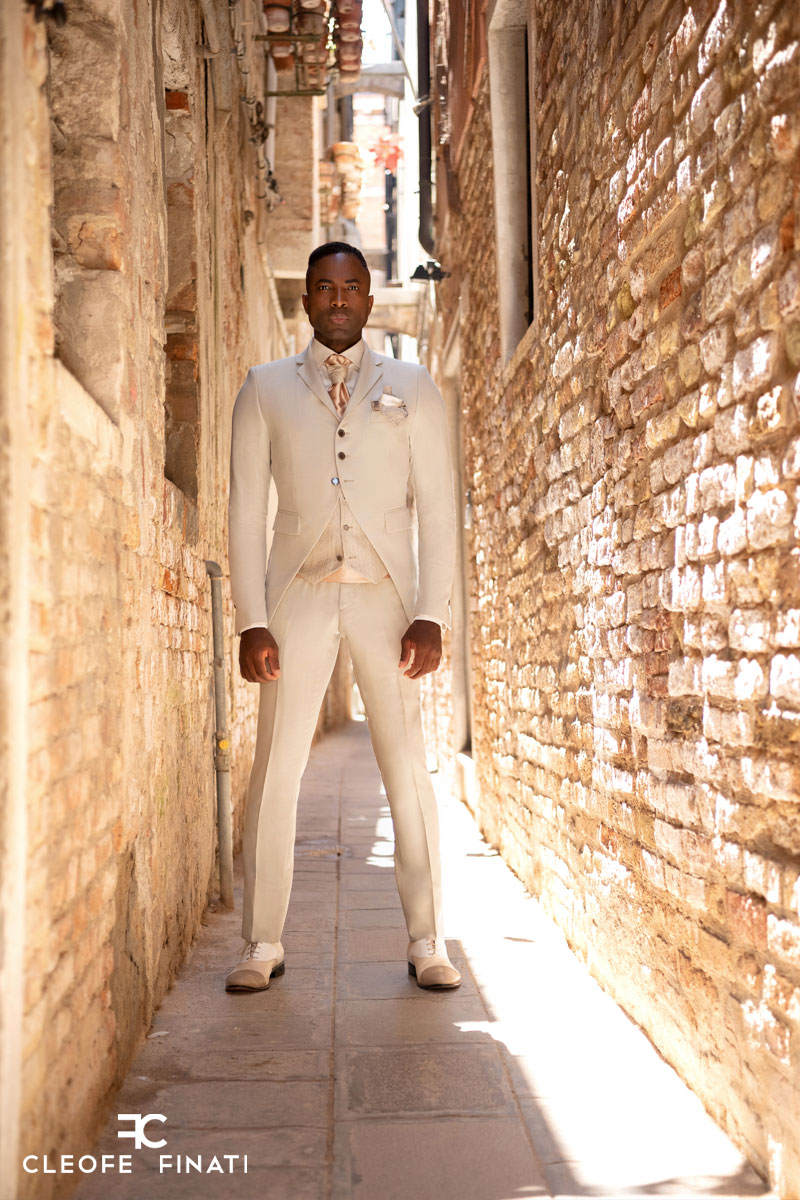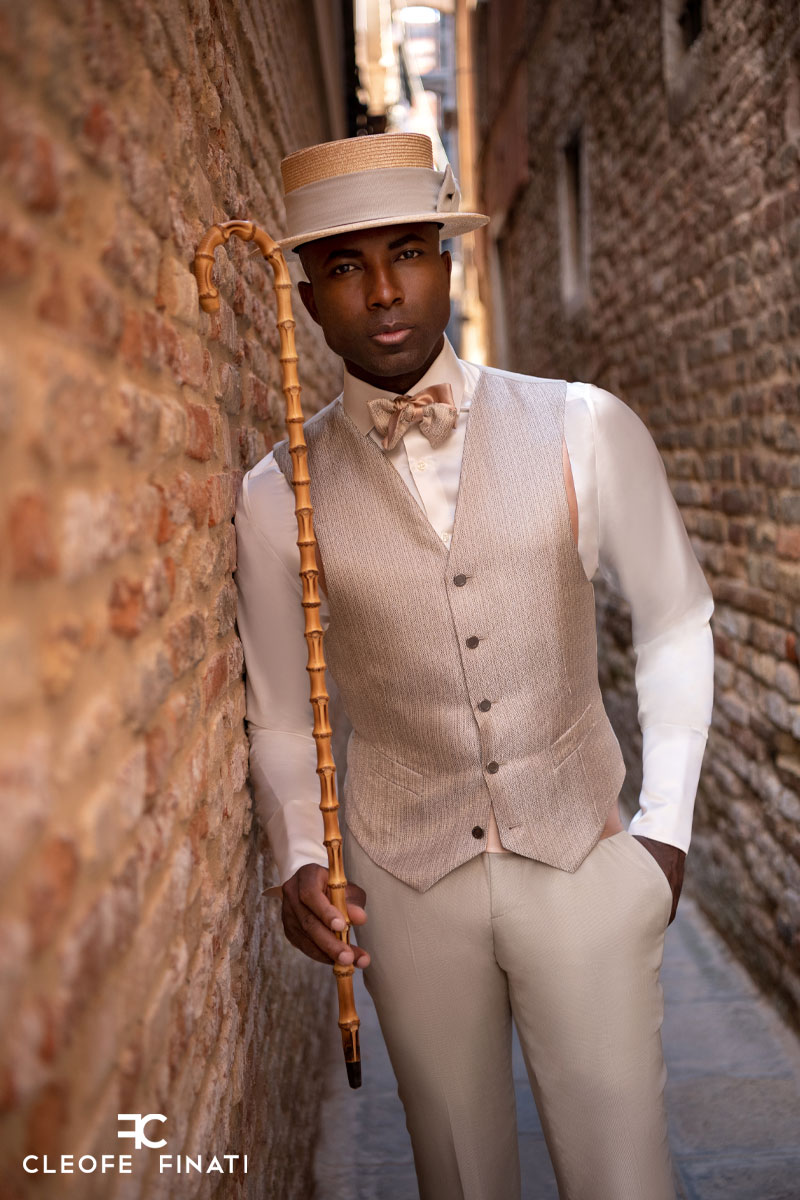 Pantalone abito da sposo uomo beige dorato linea classica fashion a coscia asciutta da poter indossare in qualunque occasione realizzato in raso di seta lana made in Italy 100%.