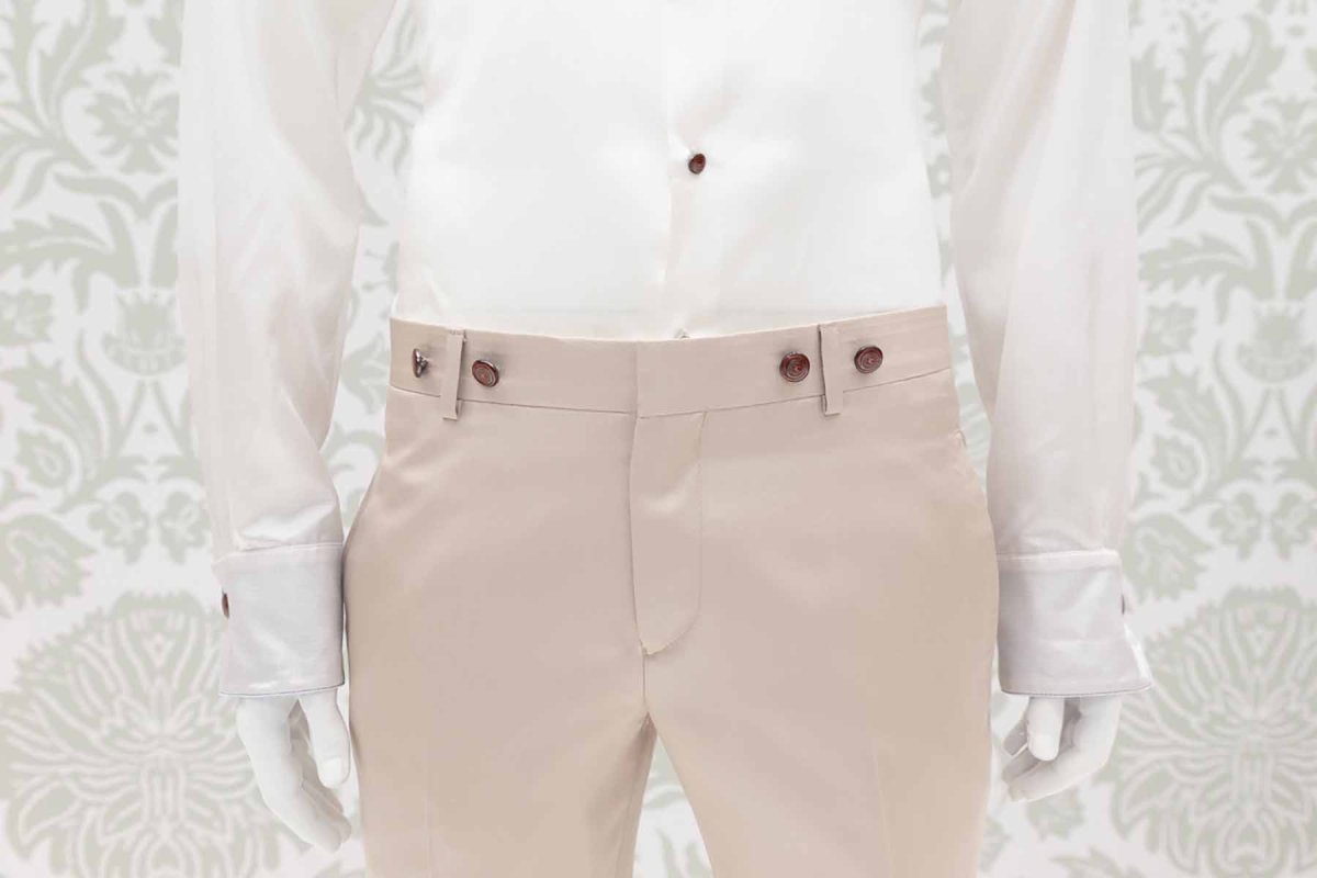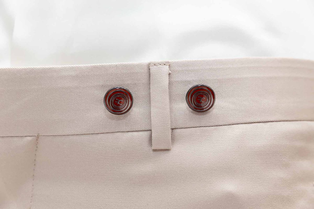 Un pantalone da uomo linea glamour, realizzato con eccellenza sartoriale made in Italy 100%, dalla linea slim senza pinces, slanciato e asciutto, con tasche a doppio filetto. Questo modello, in un gabardine 100% seta color light Havana, si adatta perfettamente alla silhouette, disegnando il corpo e slanciando la figura. Cleofe Finati realizza i pantaloni con vestibilità perfetta.