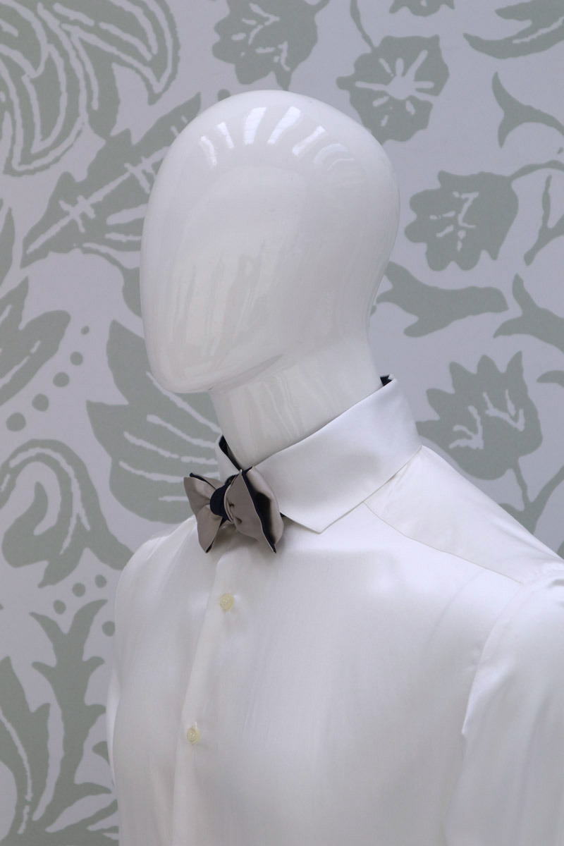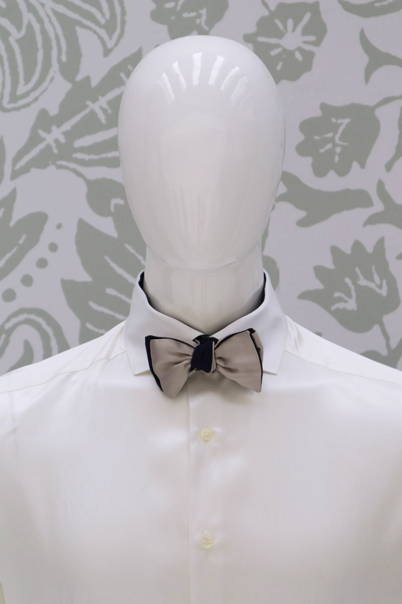 Papillon double da sposo uomo, un must per te, uomo dandy e sposo di stile, che vuoi essere impeccabile a qualsiasi ora della tua cerimonia. Abbinato al plastron, innamorati del suo raso 100% seta, beige sabbia ed un secondo raso di seta, tono su tono, blu notte.