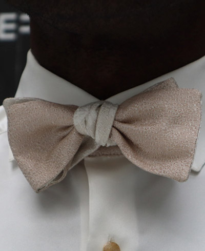 Papillon double per abito da uomo glamour made in Italy 100% in broccato crema panna e bianco, da portare al posto del plastron per un look più dandy. Seta 100%.