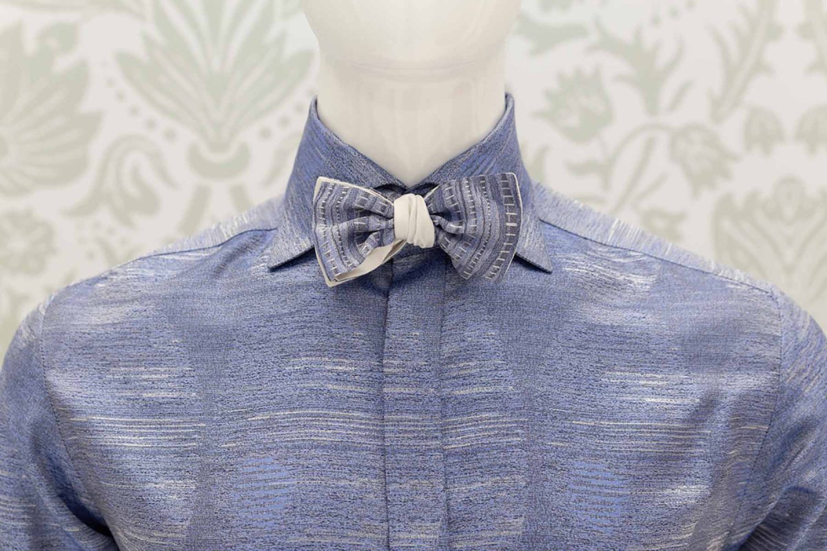 Papillon dandy double da uomo glamour, un must per te, uomo dandy e sposo di stile, che vuoi essere impeccabile a qualsiasi ora della tua cerimonia. Abbinato al plastron, innamorati del suo broccato jacquard 100% seta,caratterizzato da nervature orizzontali in senso di trama, dall’effetto granuloso e marmorizzato nelle cromie bianco e azzurro sky, insieme ad un lucente raso 100% seta bianco ottico.