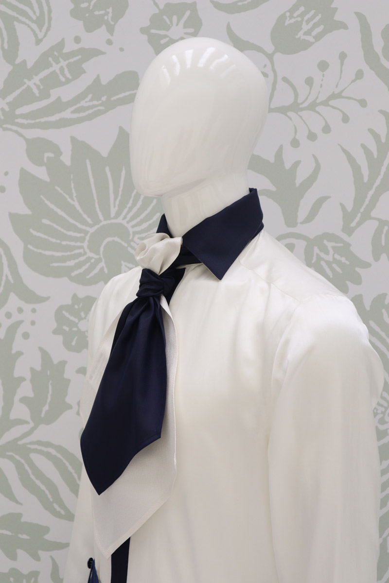 Innamorati dei tessuti che lo compongono, un morbido raso di lana seta blu notte, annodato ad un broccato di seta 100% bianco ottico e ricorda che questo accessorio lo potrai indossare sia come cravatta annodata nei due colori, sia all’interno della tua camicia, sciogliendo il nodo sia dalla parte disegnata che dalla parte unita.
