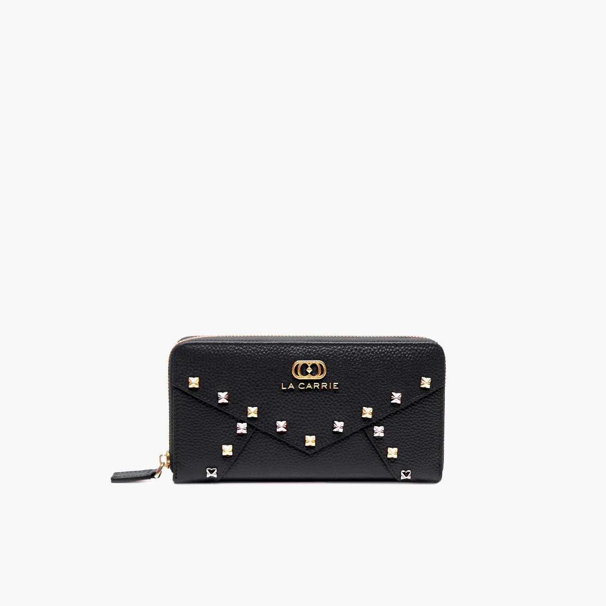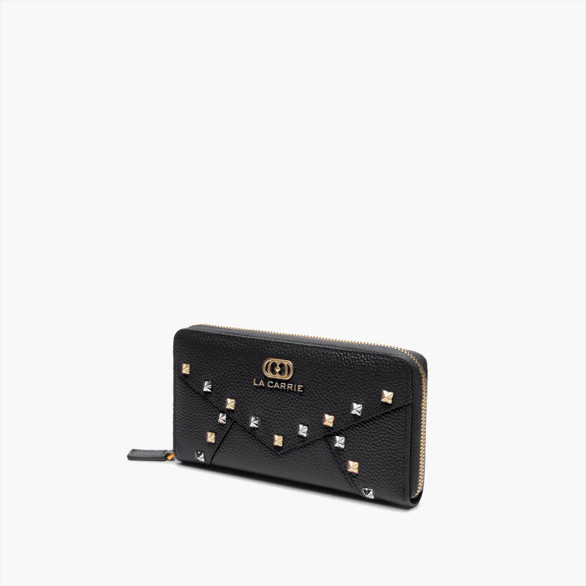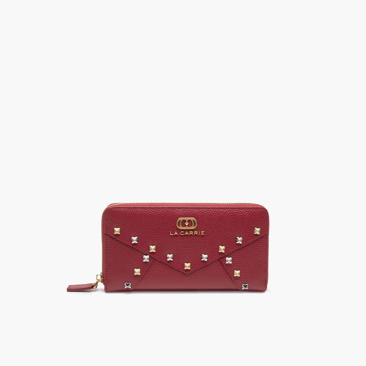 Portafogli grande in pelle martellata con borchie applicate lungo le spezzature.