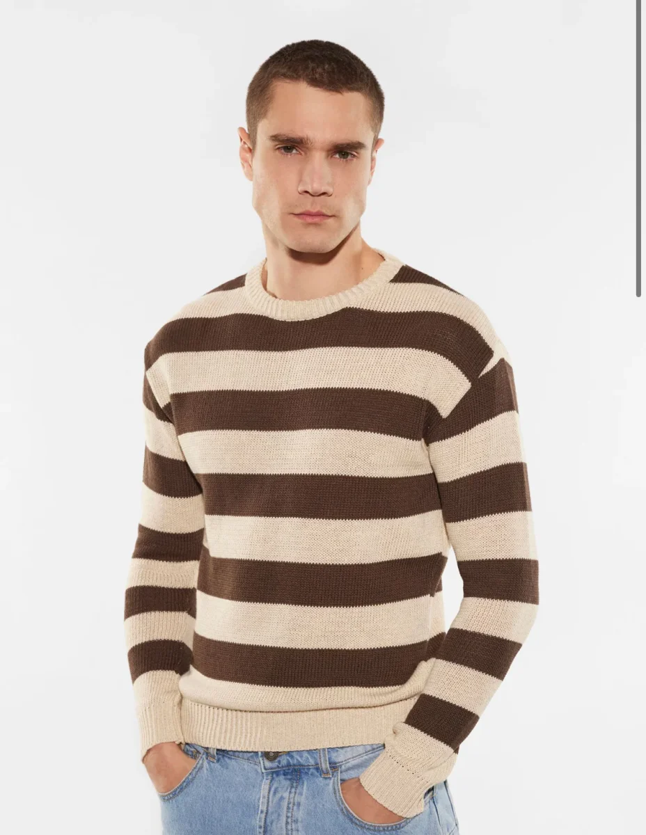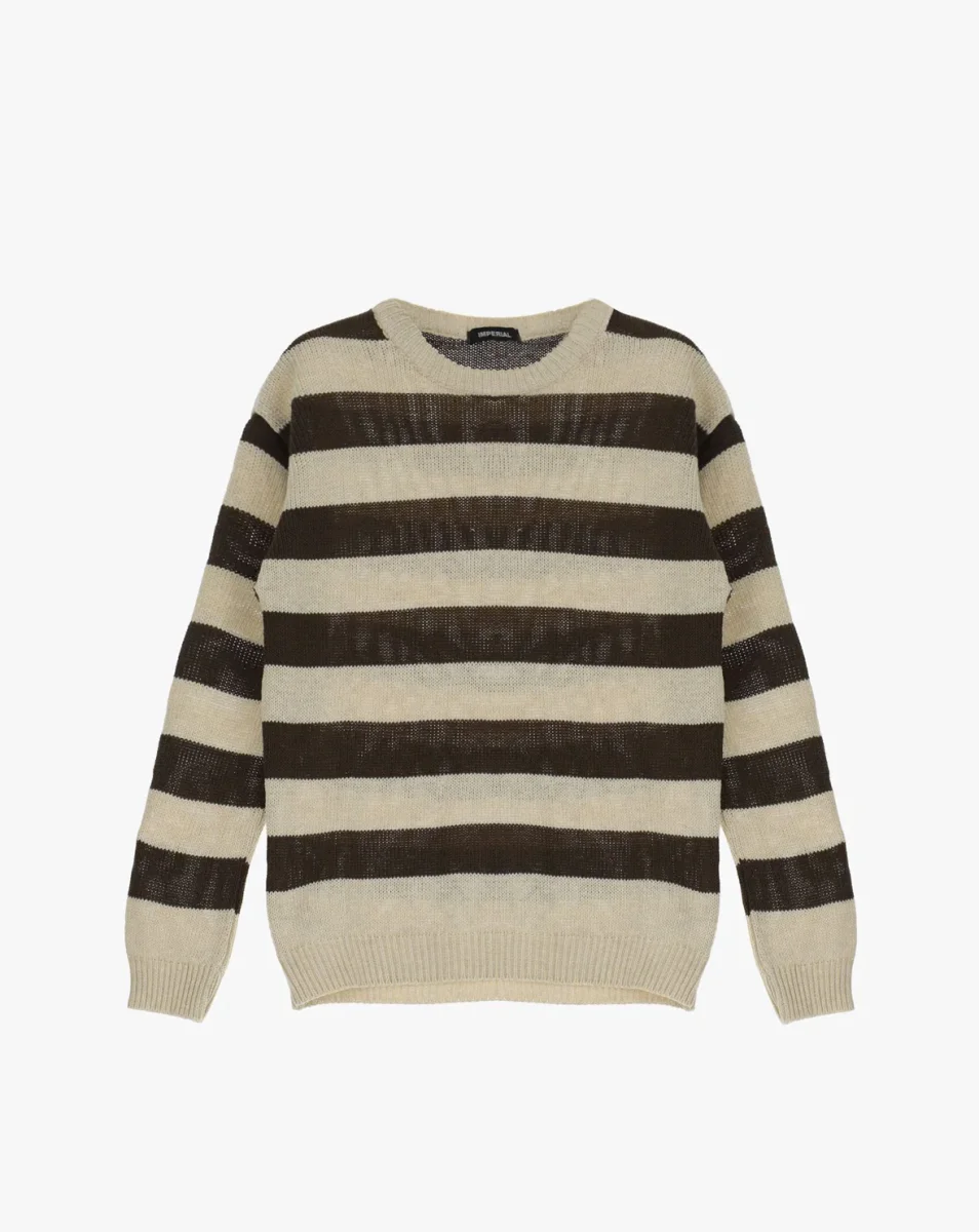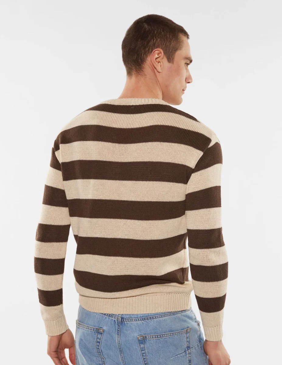 Il pullover in puro cotone è caratterizzato da scollo tondo, orli elasticizzati e fantasia a righe.