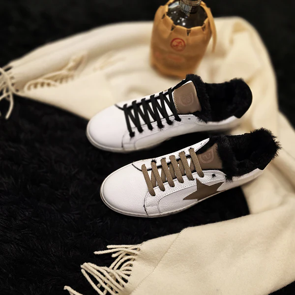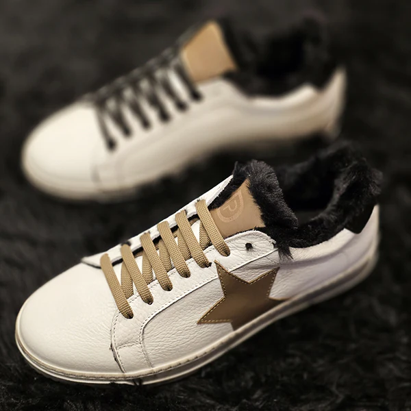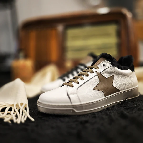 Modello sneaker realizzzaqto in pelle di vitello martellata di colore bianco con riporto tallone in camoscio nero, tab e stella in pelle di colore taupe.