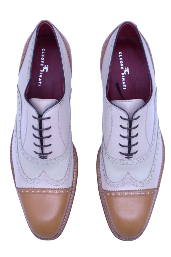 Scarpe uomo stringate da sposo in vitello a due colori, beige e bianco. Il pellame di vitello utilizzato ha una finitura opaca che rende i colori indefiniti e abbinabili ad ogni cromia di tessuto.