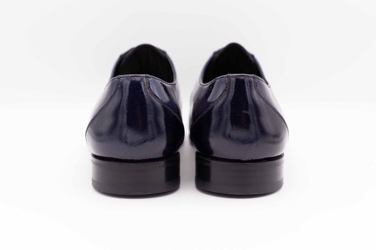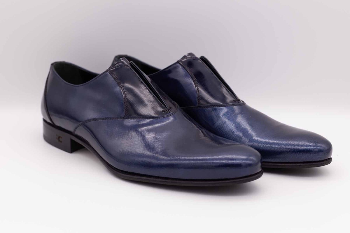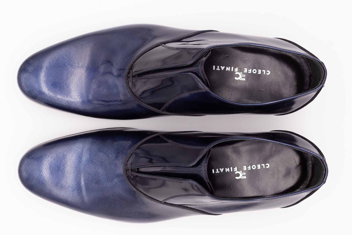 Il pellame di vitello utilizzato ha una finitura di vernice metallizzata che rende i colori indefiniti e abbinabili ad ogni cromia di tessuto. Scarpe dal design fashion e nel contempo molto elegante. Una pantofola con finta allacciatura dove il collo del piede viene trattenuto dall’elastico nascosto, nuovo trend della calzatura.