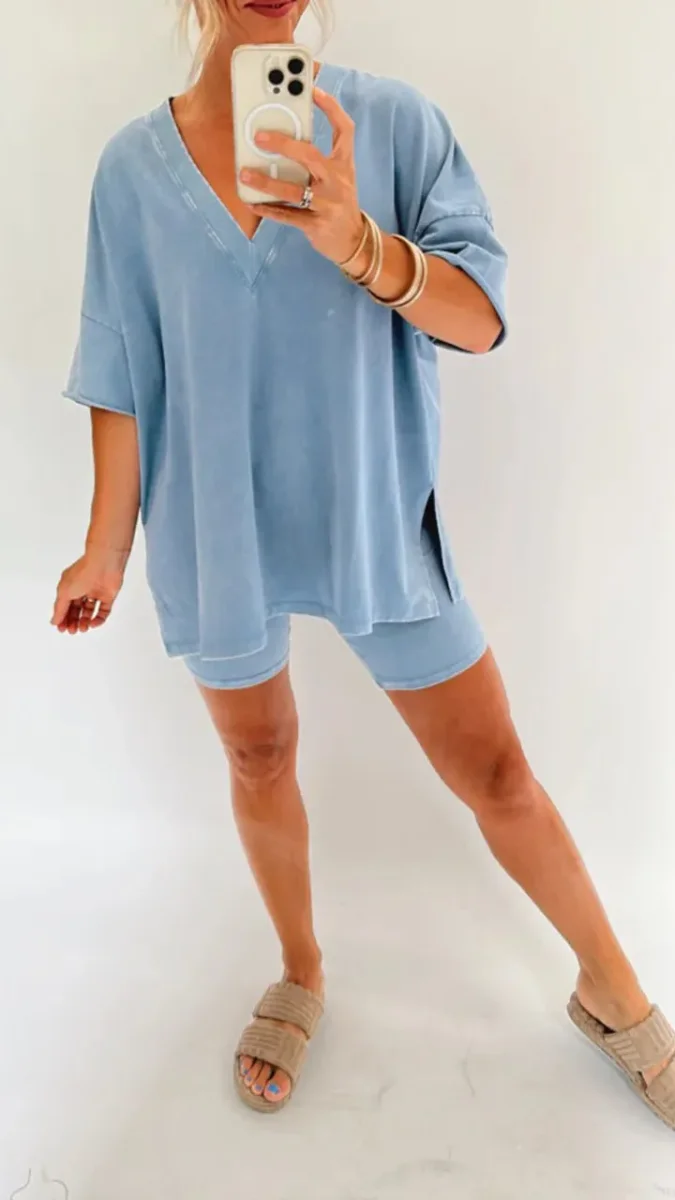 Il nostro set lavato è un capo essenziale del guardaroba e comprende una comoda t-shirt e pantaloncini da motociclista con cintura elasticizzata. Il design semplice con il taglio al ginocchio del set lo rende adatto per tutti i giorni, abbigliamento da casa, strada, outdoor, feste, viaggi, allenamento, fitness, corsa e altre occasioni.