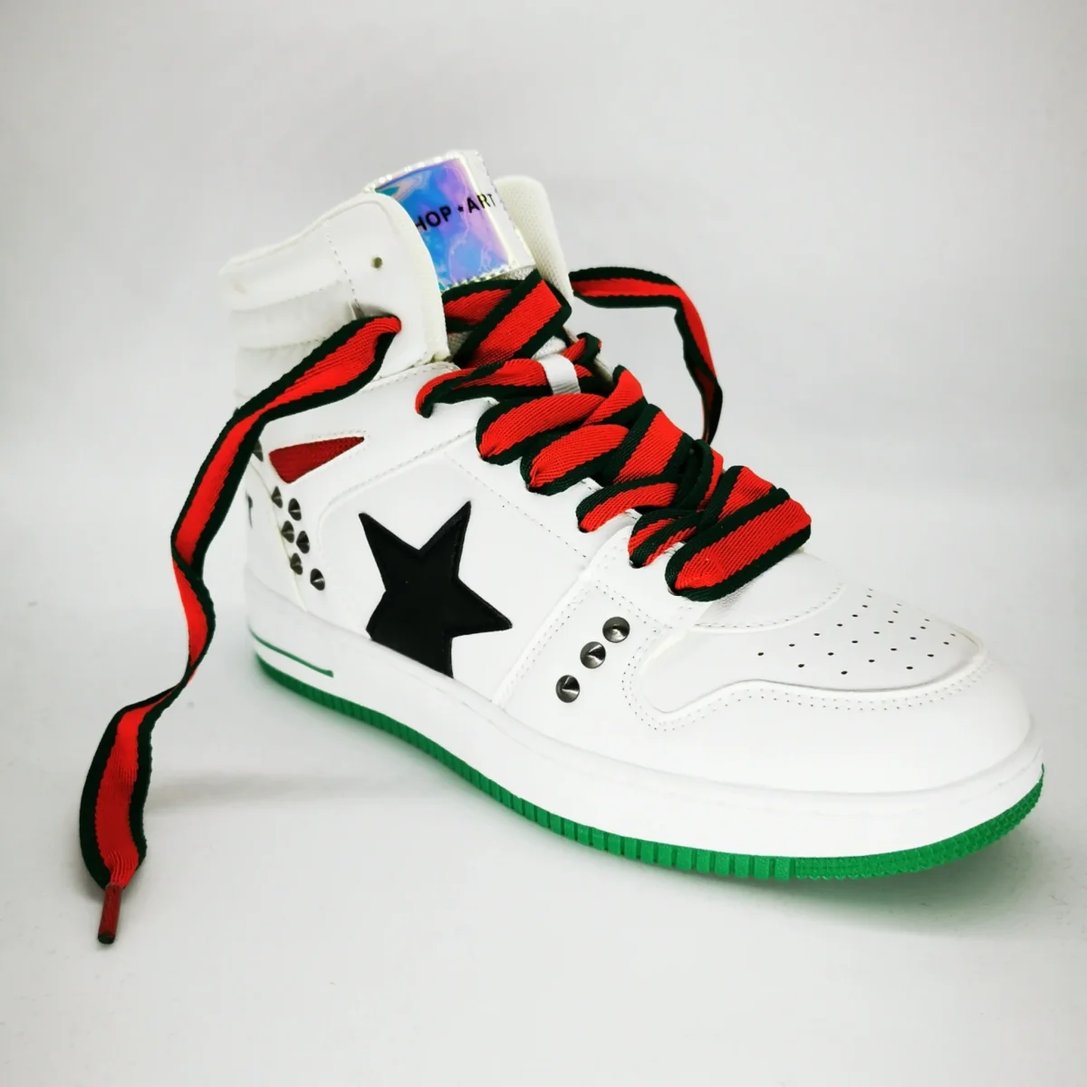 Shop Art sneakers mid-top da donna, realizzate in ecopelle, con borchiette applicate, collo imbottito e chiusura a lacci in doppia dotazione (bianchi e colorati).