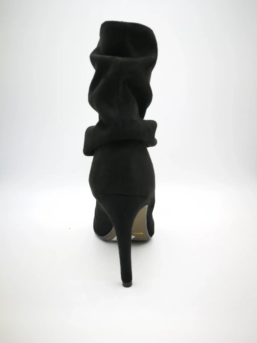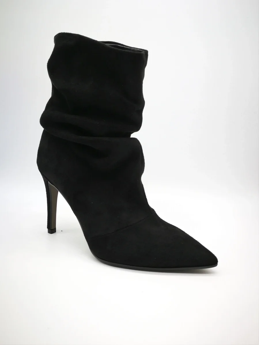 Stivaletto arricciato in camoscio, stacco stiletto a spillo da 10 cm, interno in vera pelle. 100% Made in Italy, produzione artigianale esclusiva Colbaffo®