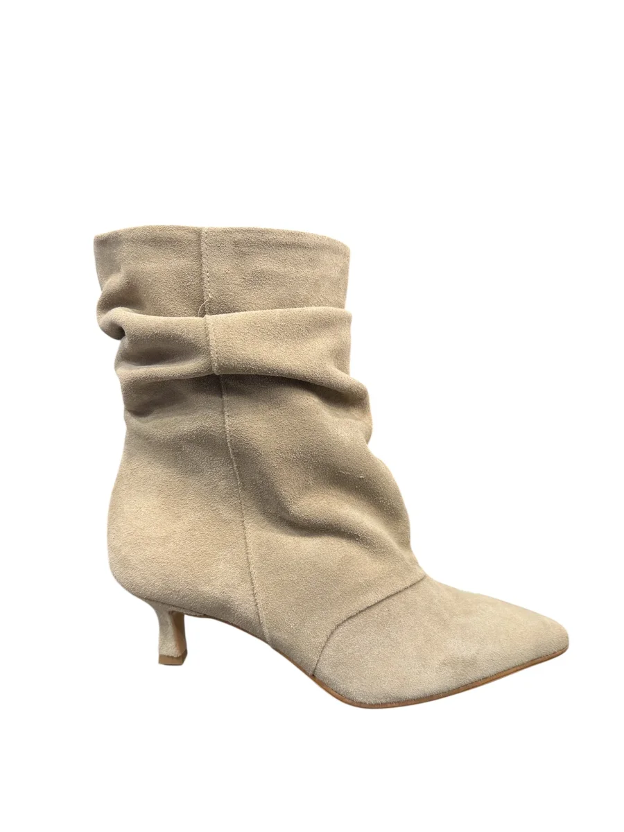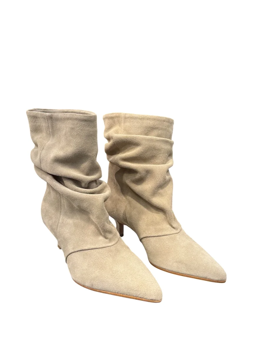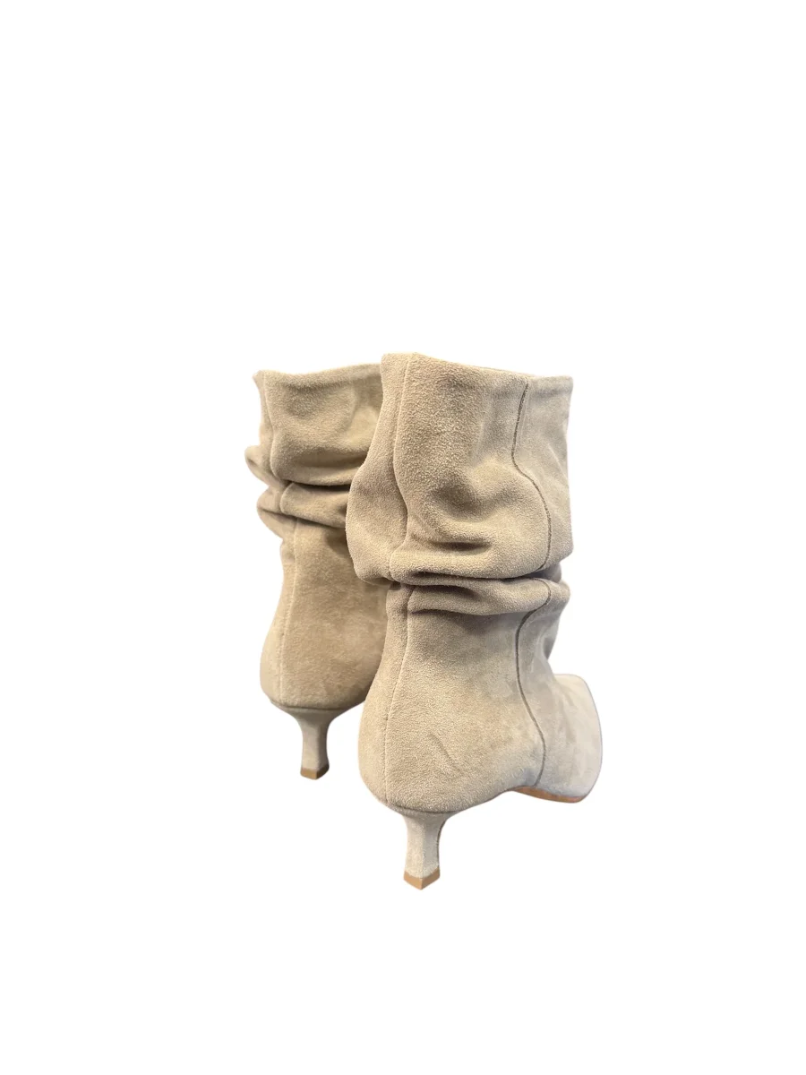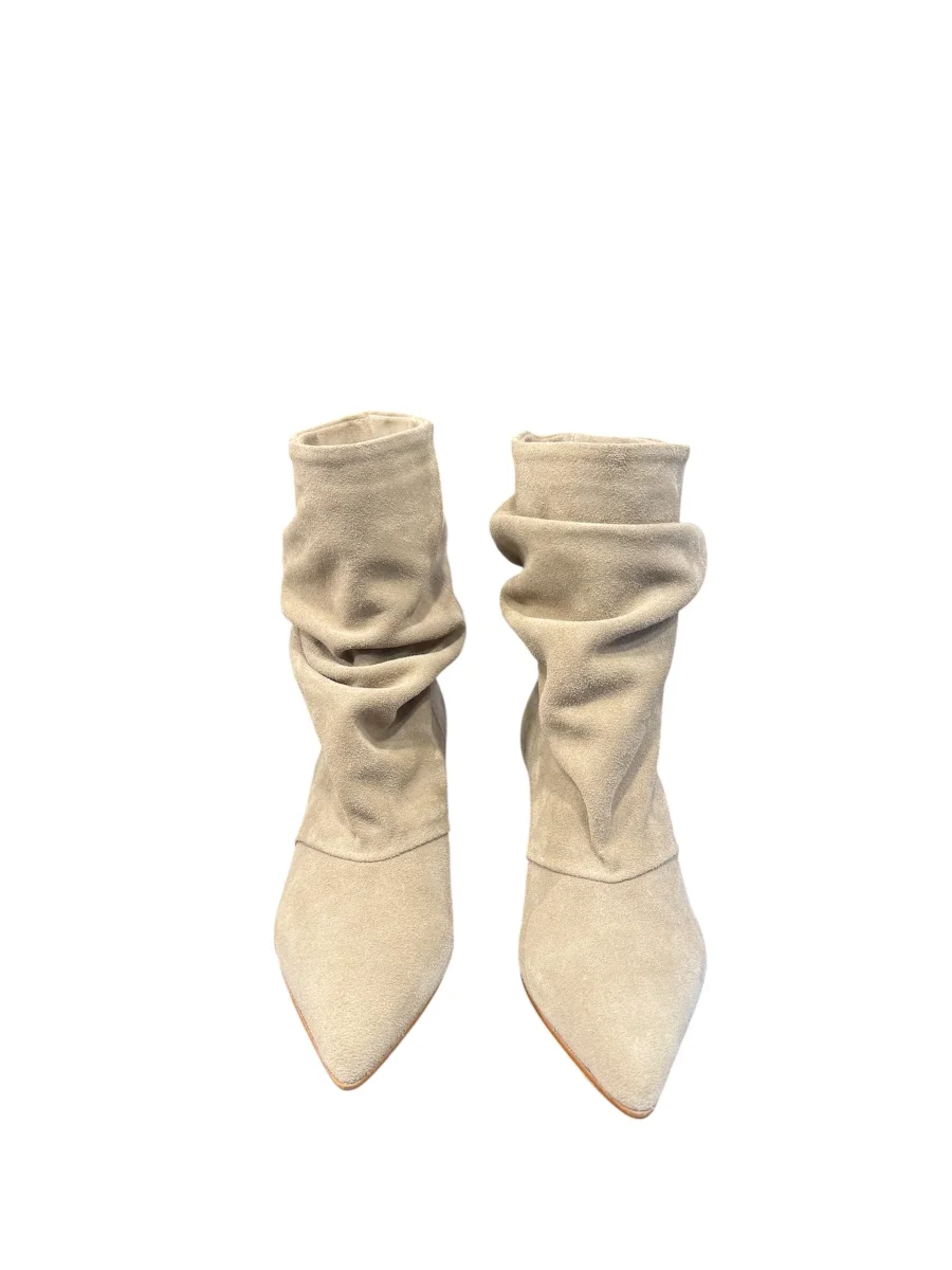 Stivaletto a tronchetto Divine Follie realizzato in camoscio beige. È caratterizzato da un design morbido e arricciato sulla gamba, una punta affilata e un sottile tacco di altezza contenuta.