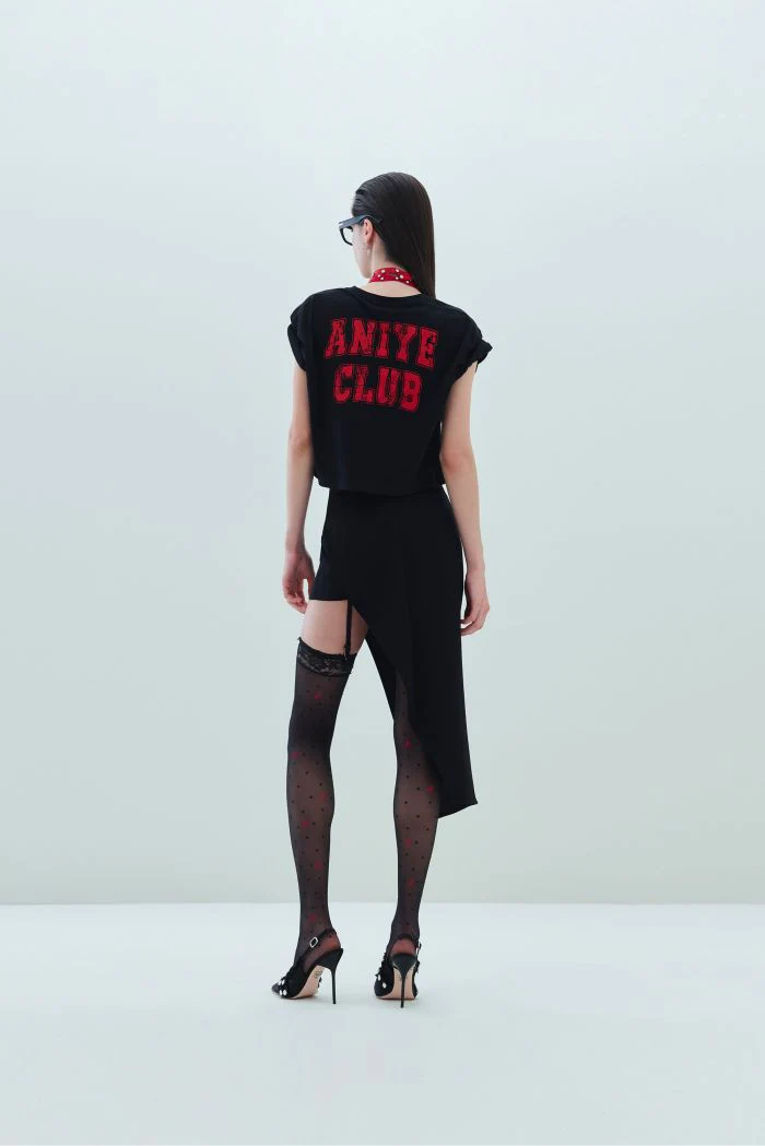 PERFETTA DA ABBINARE A PANTALONI CARGO O A UNA MINI IN PELLE, LA T-SHIRT CROPPED ANIYE KISS DONA UNA TWIST IRONICO AL GUARDAROBA CASUAL. SI DISTINGUE PER IL MAXI LETTERING “ANIYE CLUB” SUL RETRO E IL DETTAGLIO ROCK DELLE LABBRA TEMPESTATE DI STRASS SUL DAVANTI.