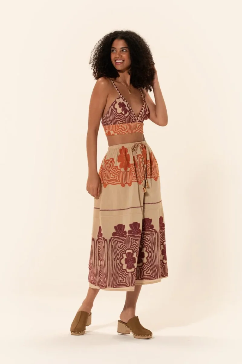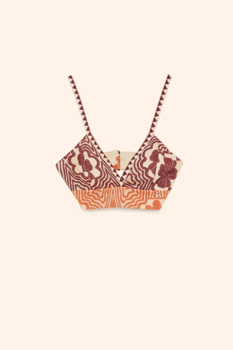 Top con spallini tipo reggiseno in tela di cotone jacquard, bordo etnico nello scollo e negli spallini.